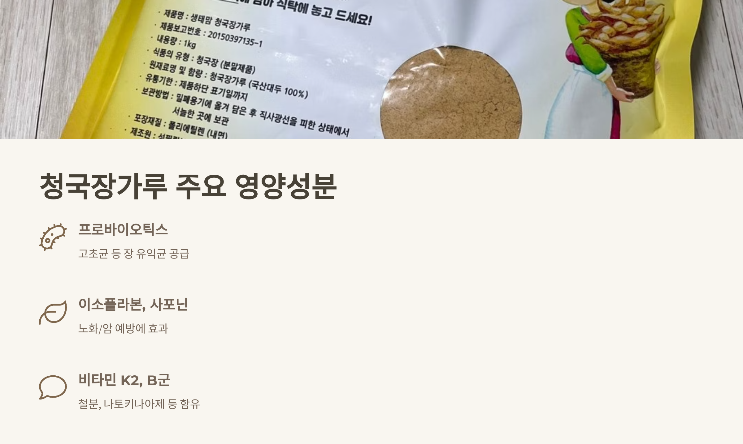 청국장가루는 삶은 콩을 발효시켜 만든 청국장을 건조 후 분쇄한 것으로, 프로바이오틱스, 비타민 K2, 이소플라본, 나토키나아제 등 건강에 유익한 성분이 가득해요.