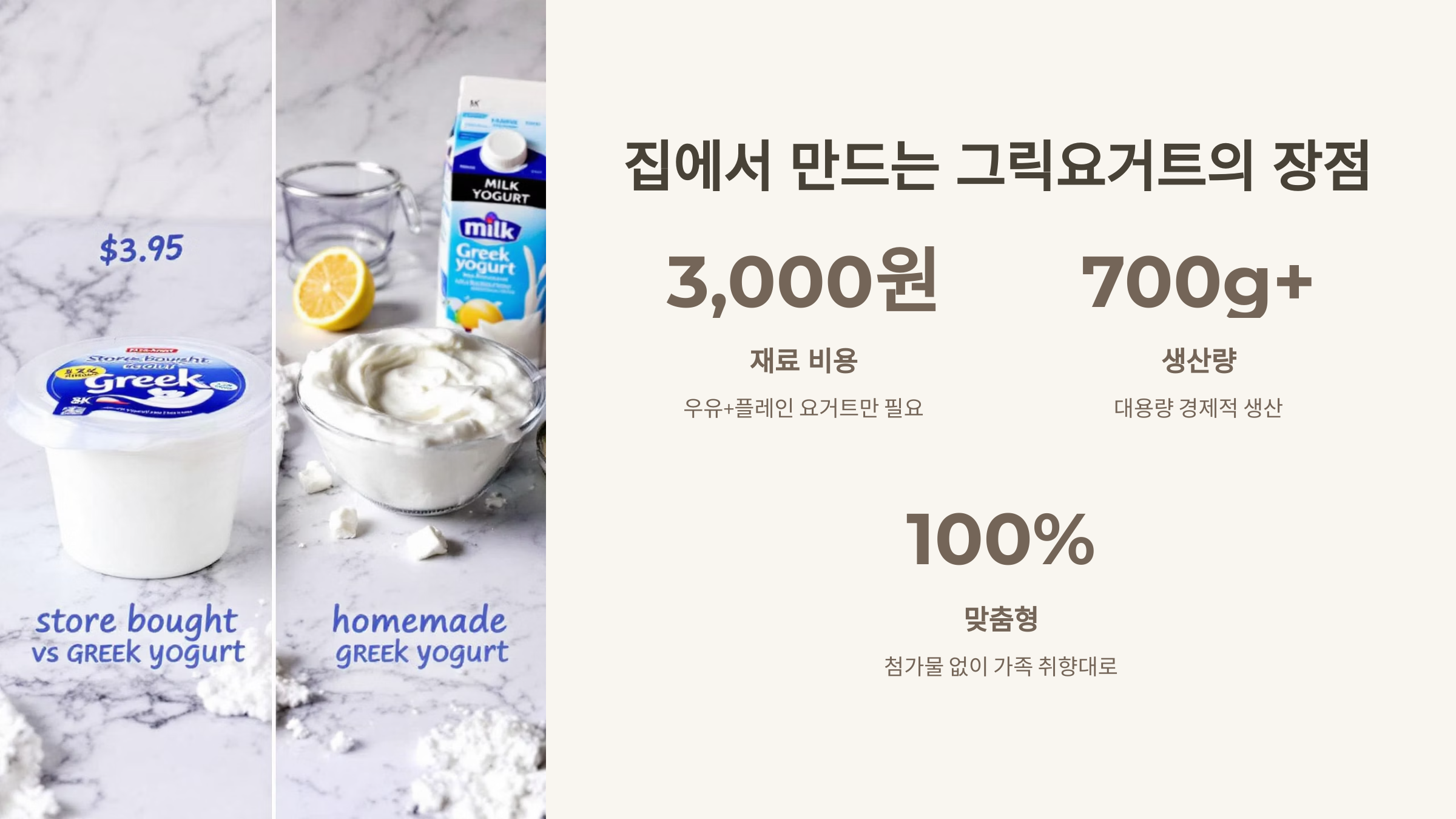 반면, 집에서 우유로 요거트를 만들면 900ml 우유(약 2,000원)와 플레인 요거트 130ml(약 1,000원)로 700g 이상의 그릭요거트를 만들 수 있어요. 게다가 설탕이나 인공 첨가물 없이 순수한 재료로 만들 수 있어 건강에도 좋아요!