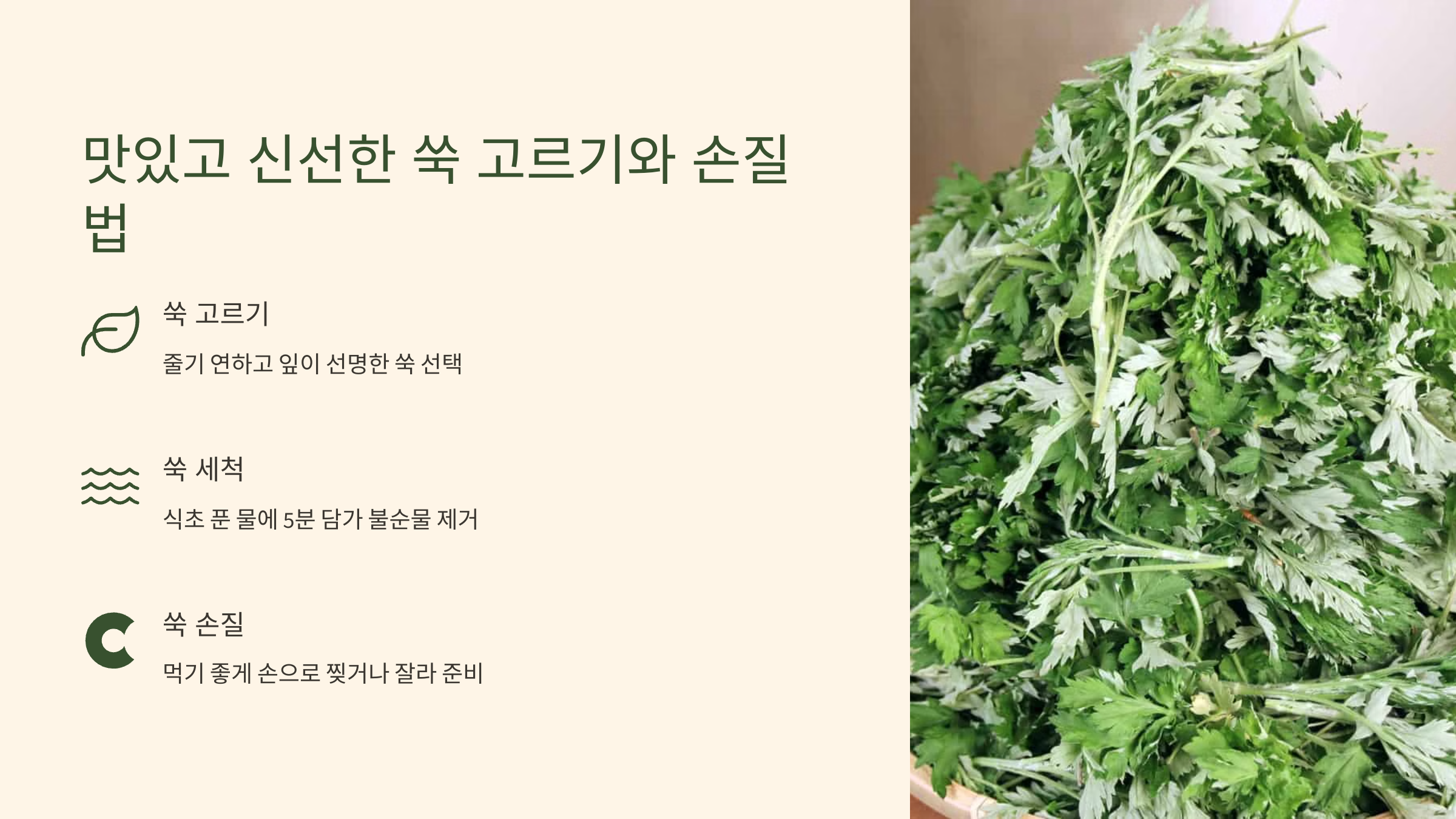 쓴맛이 걱정된다면 쑥을 끓는 물에 10~15초 데친 뒤 찬물에 헹궈 사용하세요. 데치면 쓴맛이 줄어들고 부드러운 식감이 살아납니다.