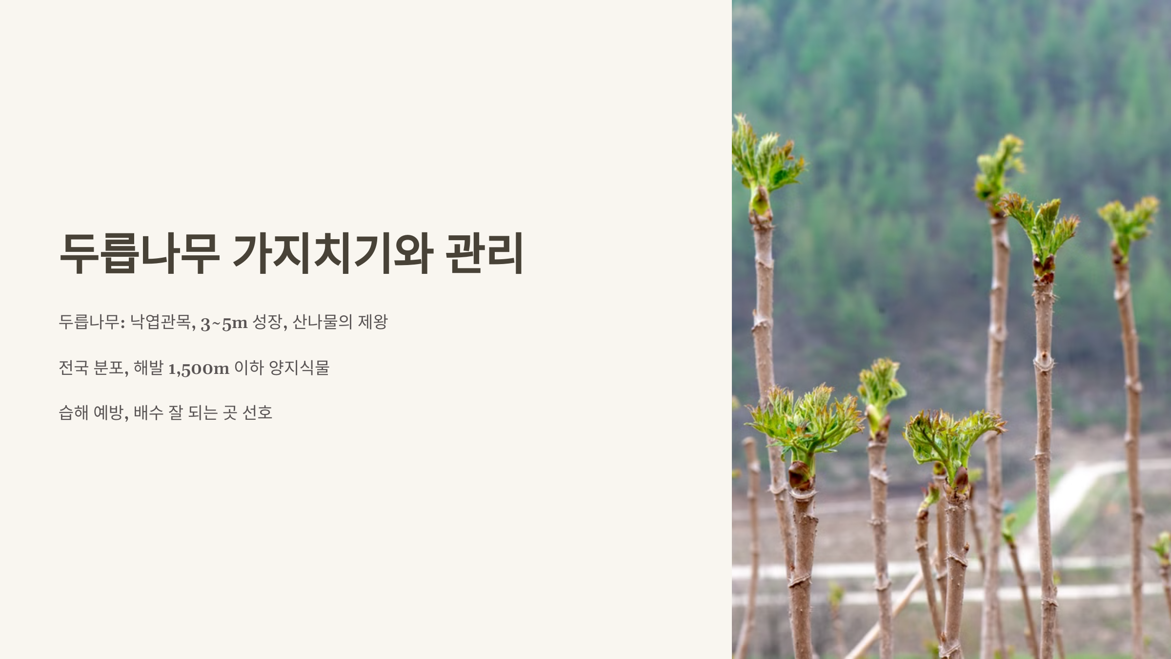 안녕하세요! 오늘은 봄철 식탁을 풍성하게 만드는 두릅을 위한 두릅나무 가지치기 시기와 전지방법을 자세히 소개합니다. 😊 두릅나무(Aralia elata)는 한국, 일본, 중국 등지에 자라는 낙엽활엽 관목으로, 4~5월에 돋는 새순은 독특한 향과 쌉싸름한 맛으로 ‘산나물의 제왕’이라 불립니다.