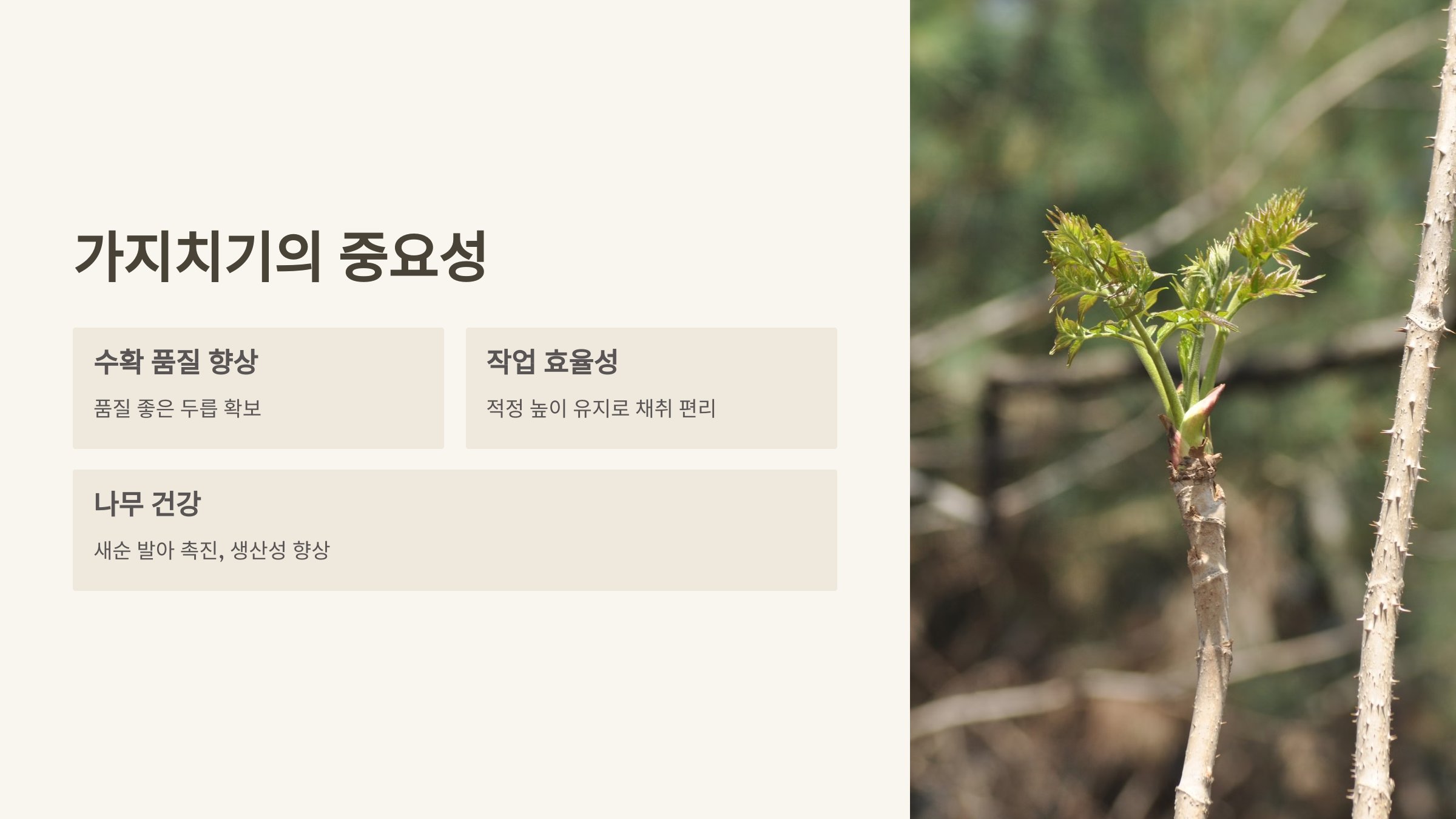 | 3년차 이후 | 1.5~2m 높이 유지, 기저부 새순 3~4개만 남긴다. | 영양분 집중, 고품질 두릅 생산 |