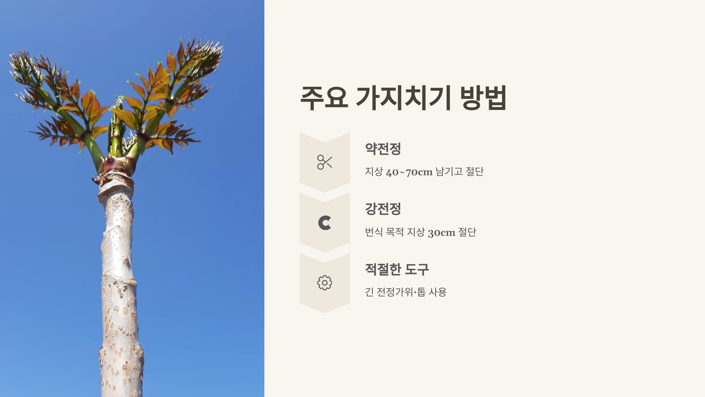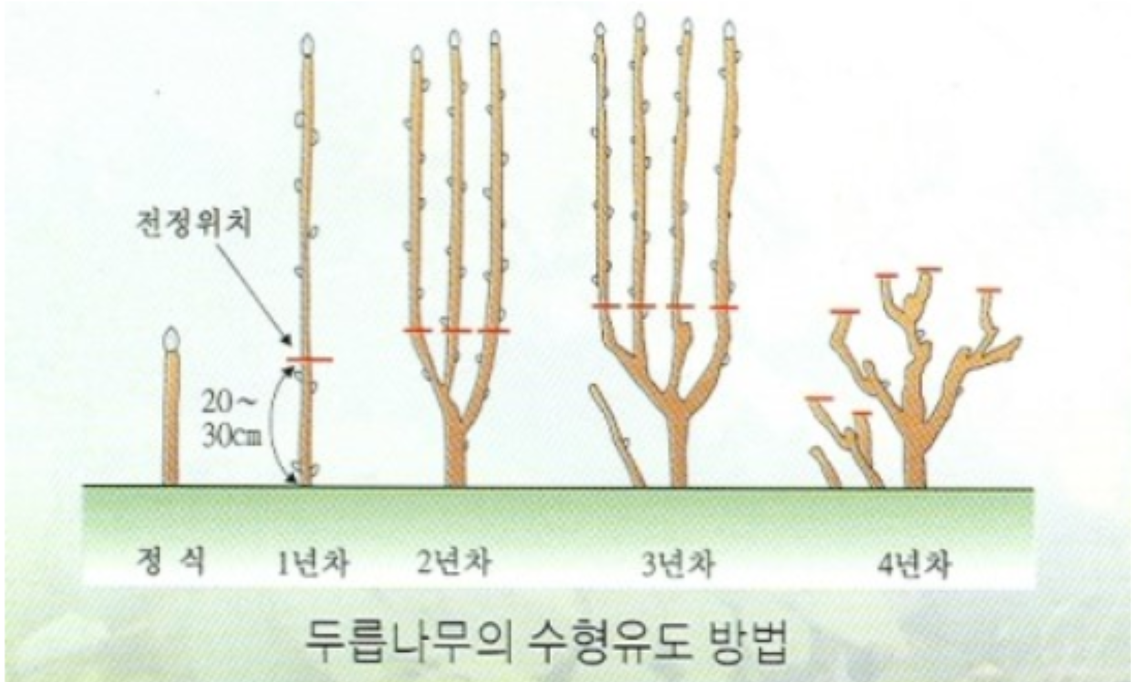 | 1년차 | 지면에서 30cm 높이로 자른다. | 뿌리 내림 촉진, 초기 성장 유도 |