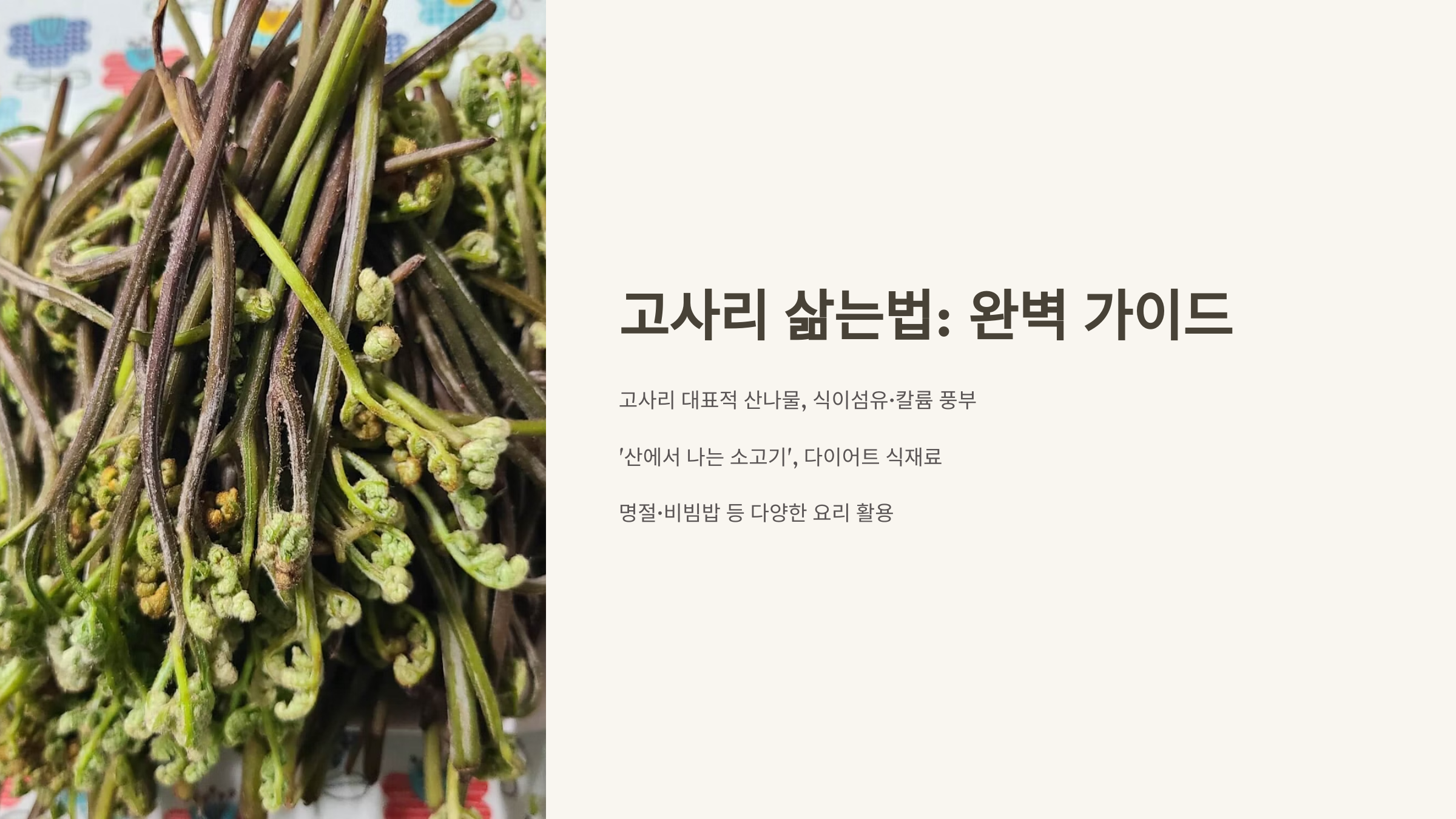 🌱 안녕하세요! 오늘은 한국의 대표적인 산나물, 고사리 삶는법을 아주 상세히 알아볼게요. 고사리는 영양이 풍부해 명절 음식부터 일상 반찬까지 다양한 요리에 활용됩니다.