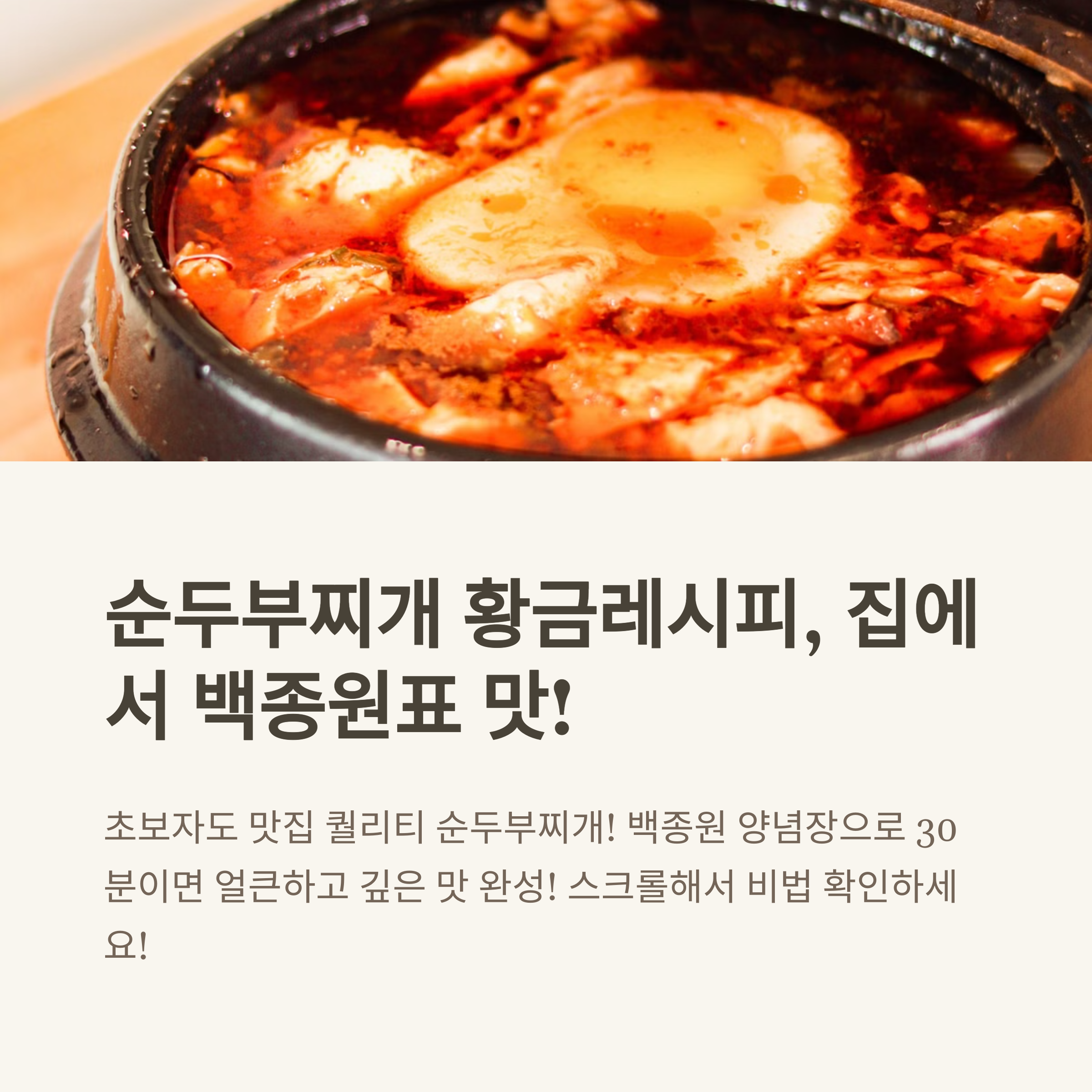 순두부찌개 황금레시피는 백종원 셰프의 노하우가 담긴 간단하면서도 맛있는 레시피입니다. 양념장을 미리 준비해 두면 바쁜 날에도 15분 만에 완성할 수 있어요.