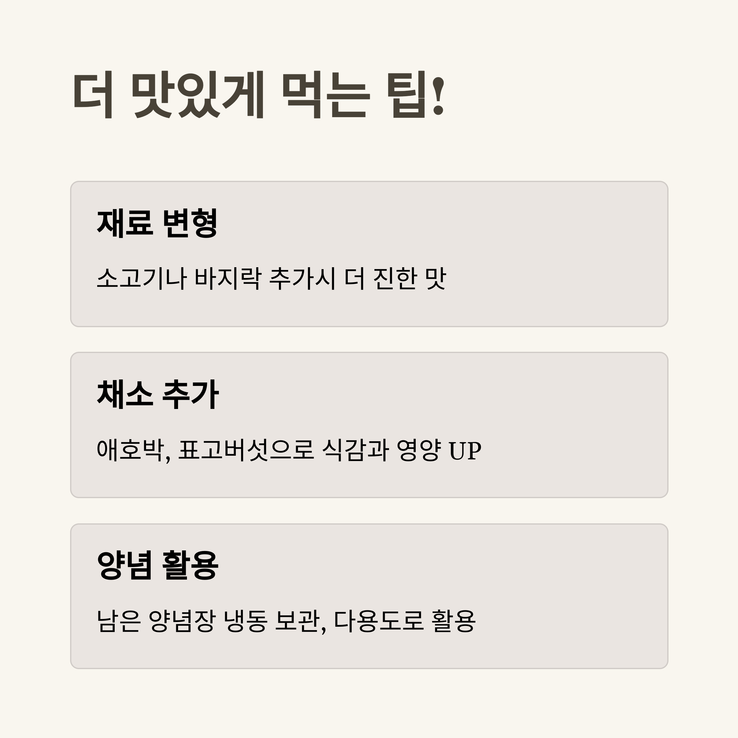 -맛 조절: 매운맛이 강하면 고춧가루를 2큰술로 줄이거나 설탕을 1/2작은술 추가한다.