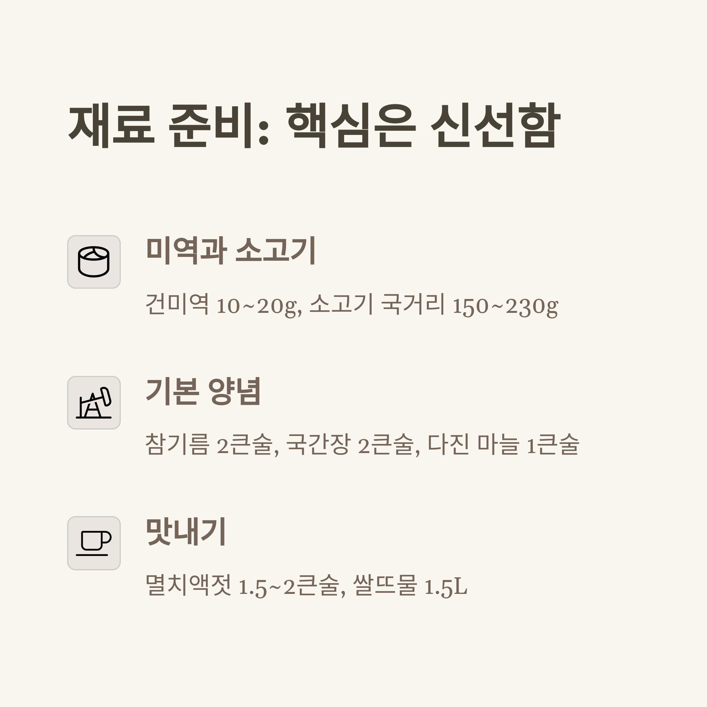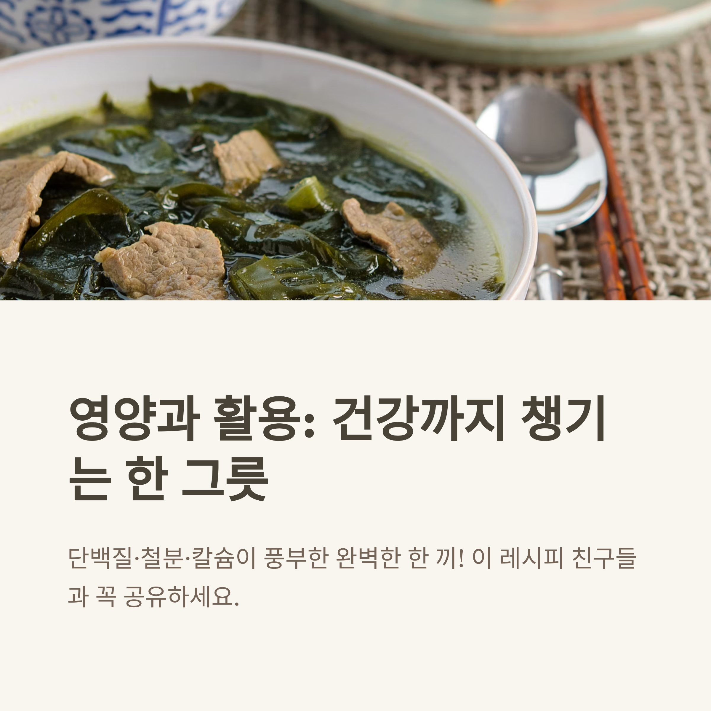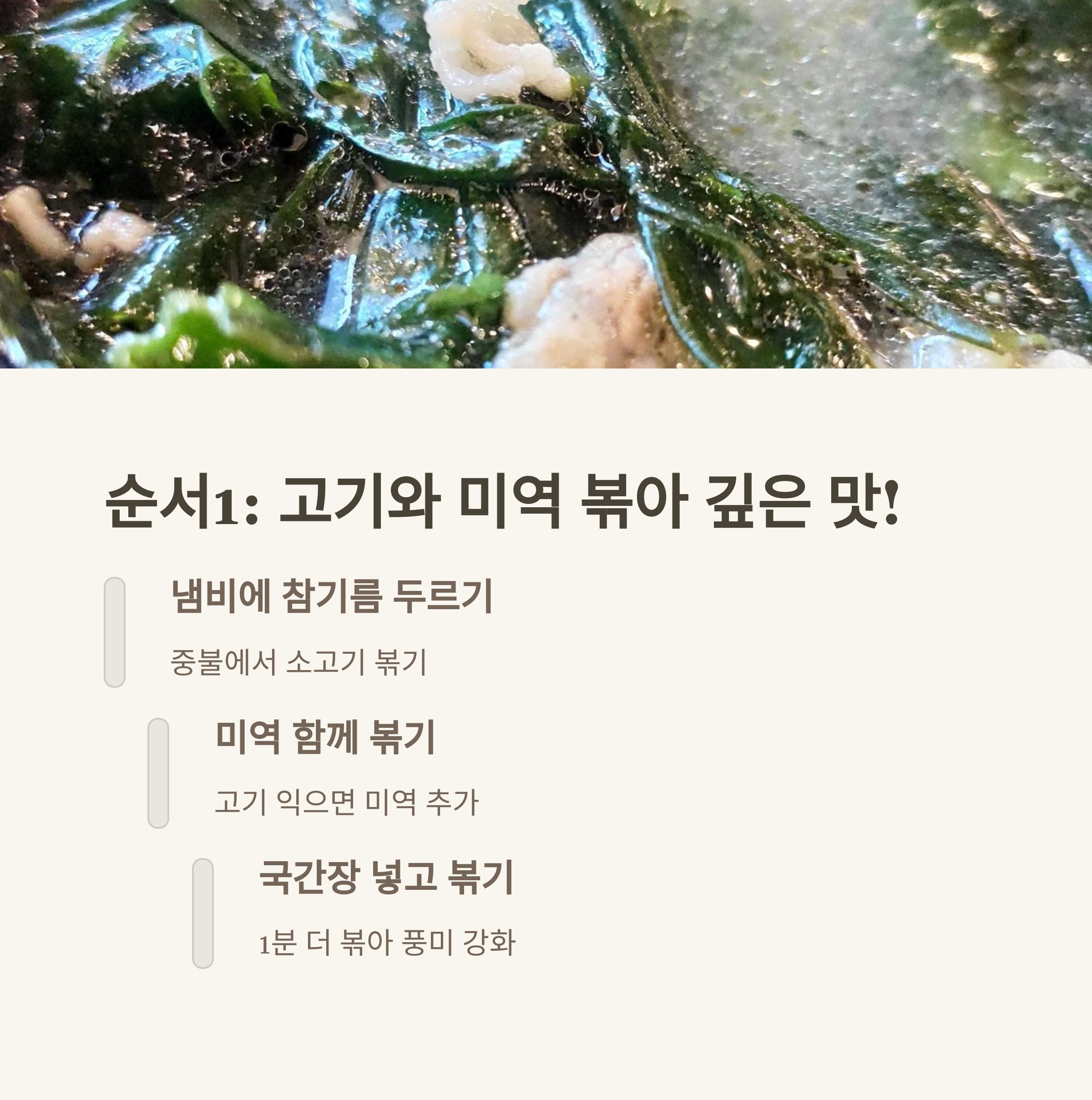 -참기름 활용: 소고기와 미역을 볶을 때 참기름을 넉넉히 사용해 고소한 풍미를 극대화하세요. 기름이 적으면 맛이 덜할 수 있어요.