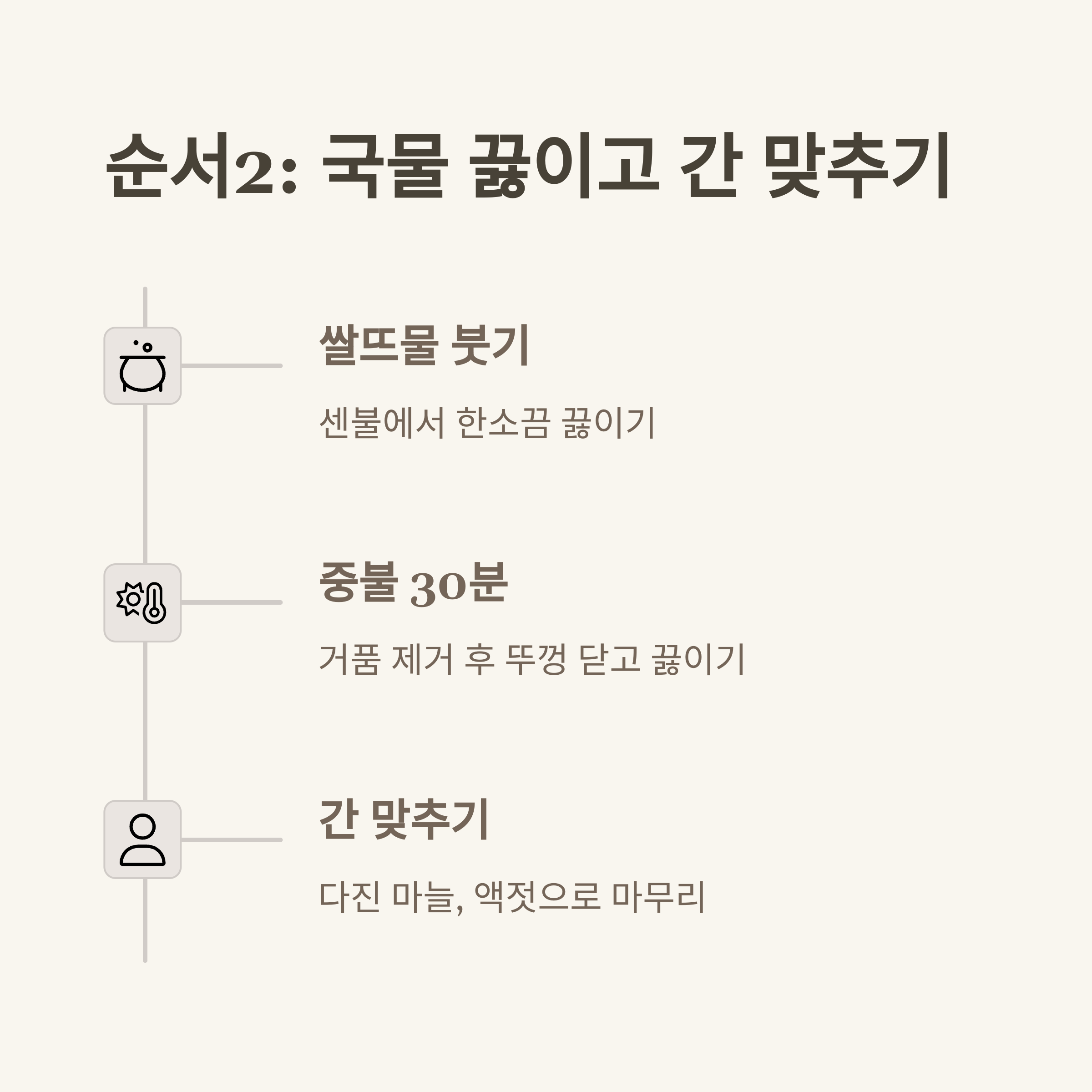 물 1.5~1.8L를 부은 뒤 센 불에서 끓입니다. 끓기 시작하면 거품을 걷어내고, 국간장 2큰술, 멸치액젓 1큰술, 다진 마늘 1큰술을 넣어 간을 맞춥니다. 백종원 레시피는 간단한 양념으로 깊은 맛을 내는 게 장점이에요.