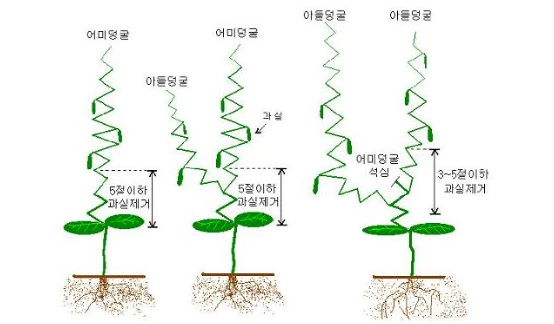 | 단호박 | 5~6마디 | 어미줄기, 8마디까지 열매 | 지지대 설치로 통풍 개선 |
