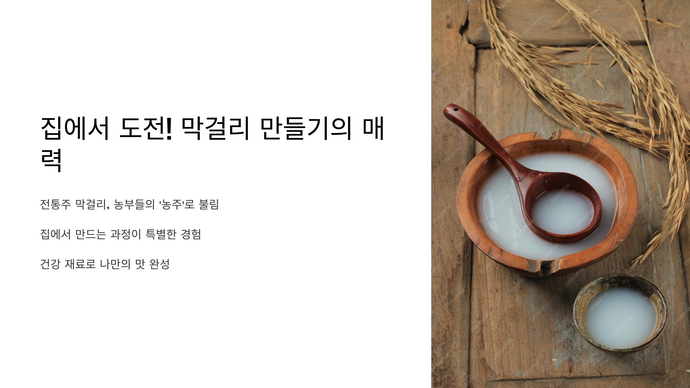 과거 농부들이 일터에서 에너지를 얻기 위해 마시던 ‘농주’로도 불리며, 오랜 역사와 문화를 담고 있죠. 집에서 직접 만들면 건강한 재료로 나만의 막걸리를 즐길 수 있고, 만드는 과정 자체가 특별한 경험이 됩니다.