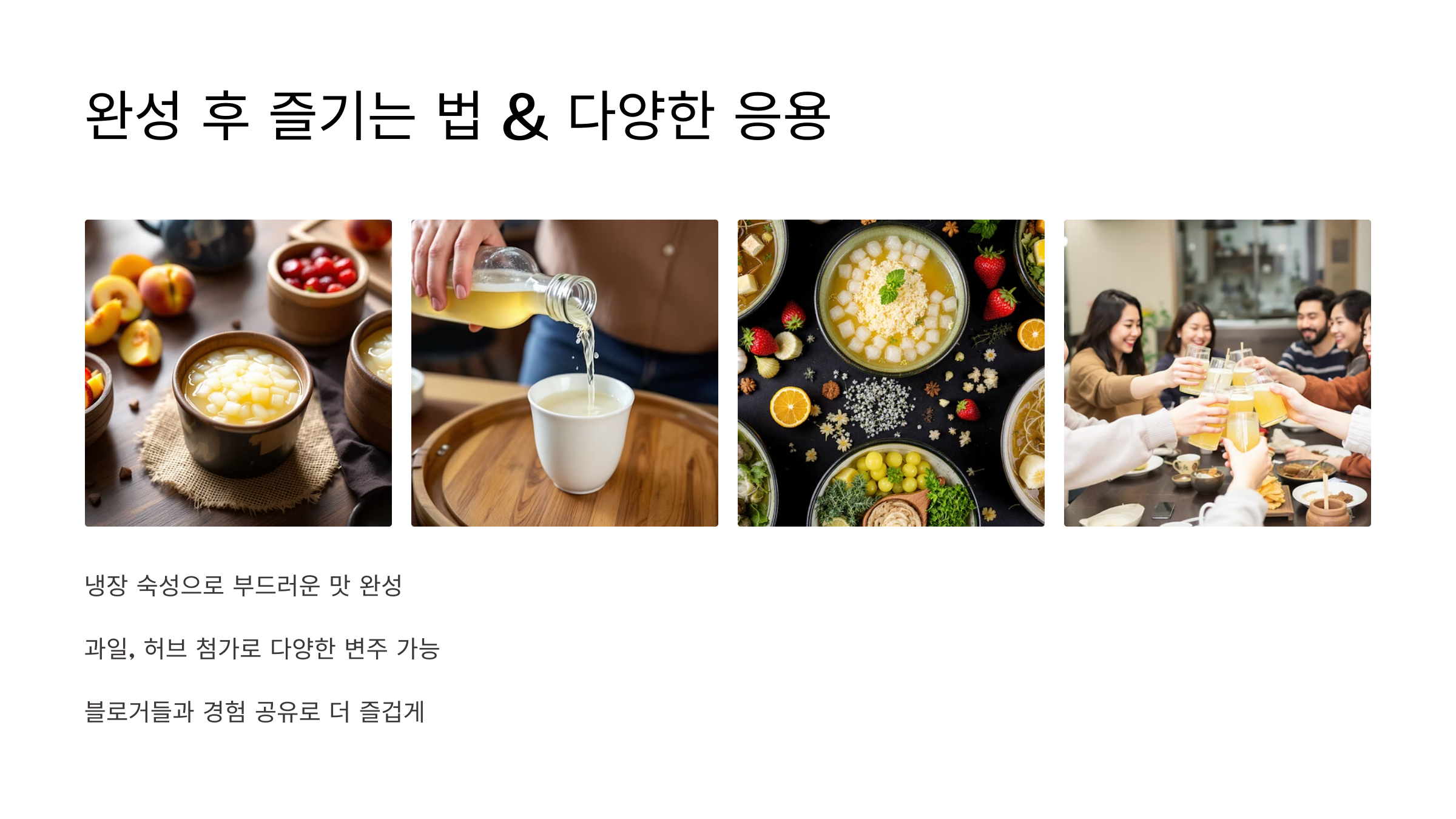 막걸리 만들기에 익숙해졌다면, 자신만의 스타일을 추가해보세요! 아래는 몇 가지 변형 아이디어입니다: