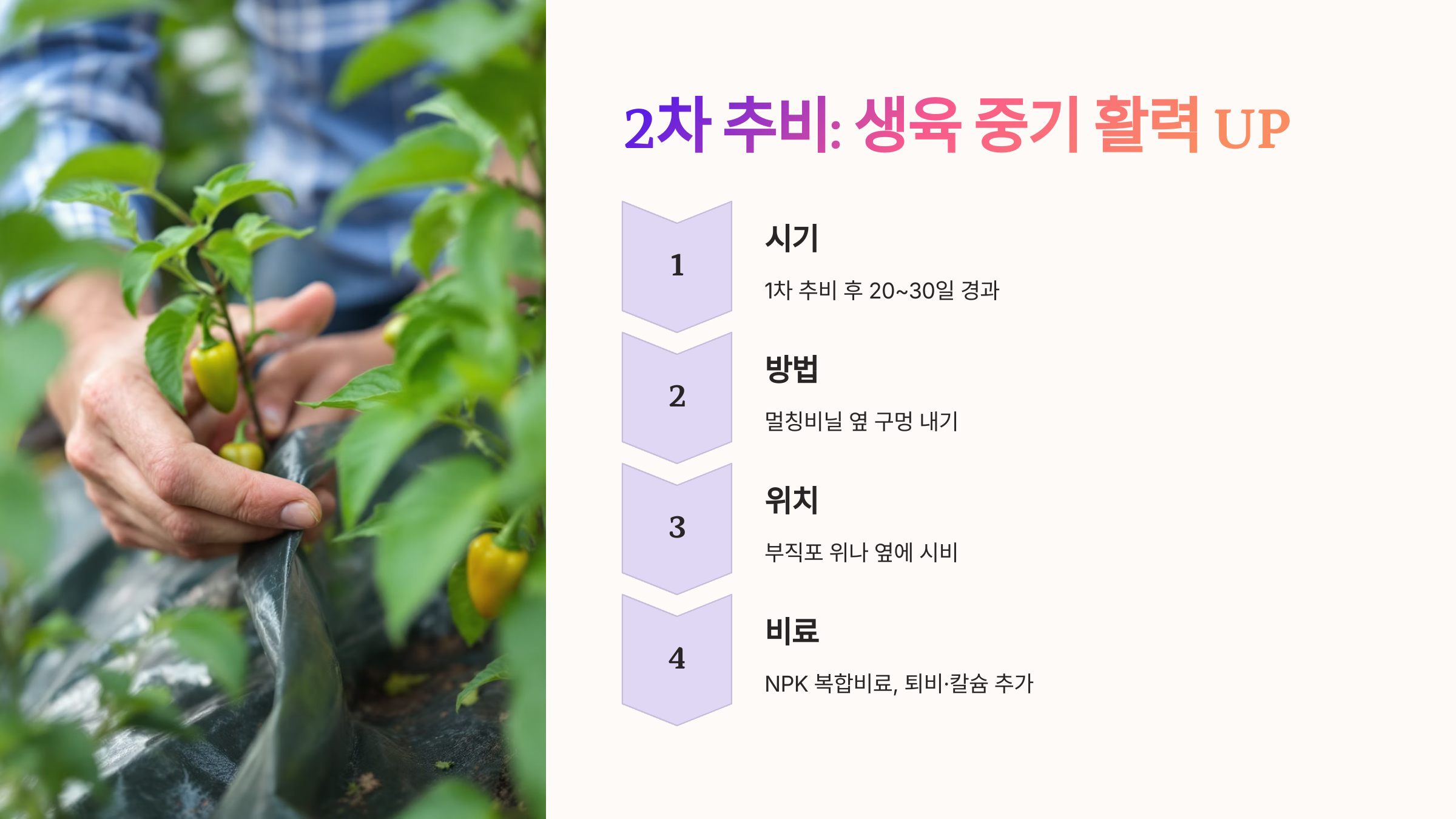 웃거름 주는 시기를 잘 맞추면 고추가 튼튼하게 자라며 병충해에도 강해집니다. 아래에서 각 추비 단계별로 구체적인 방법을 알아볼게요! 📌