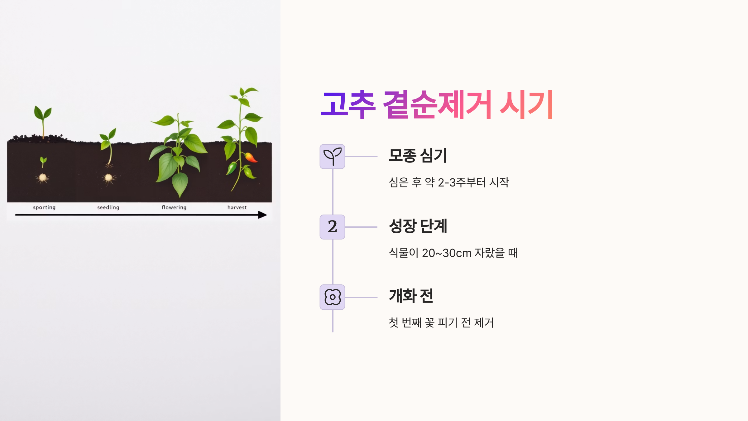 -주 잎 보존: 주 잎을 모두 제거하면 광합성이 줄어 고추 성장이 저하됩니다. 곁순만 정확히 제거하세요.