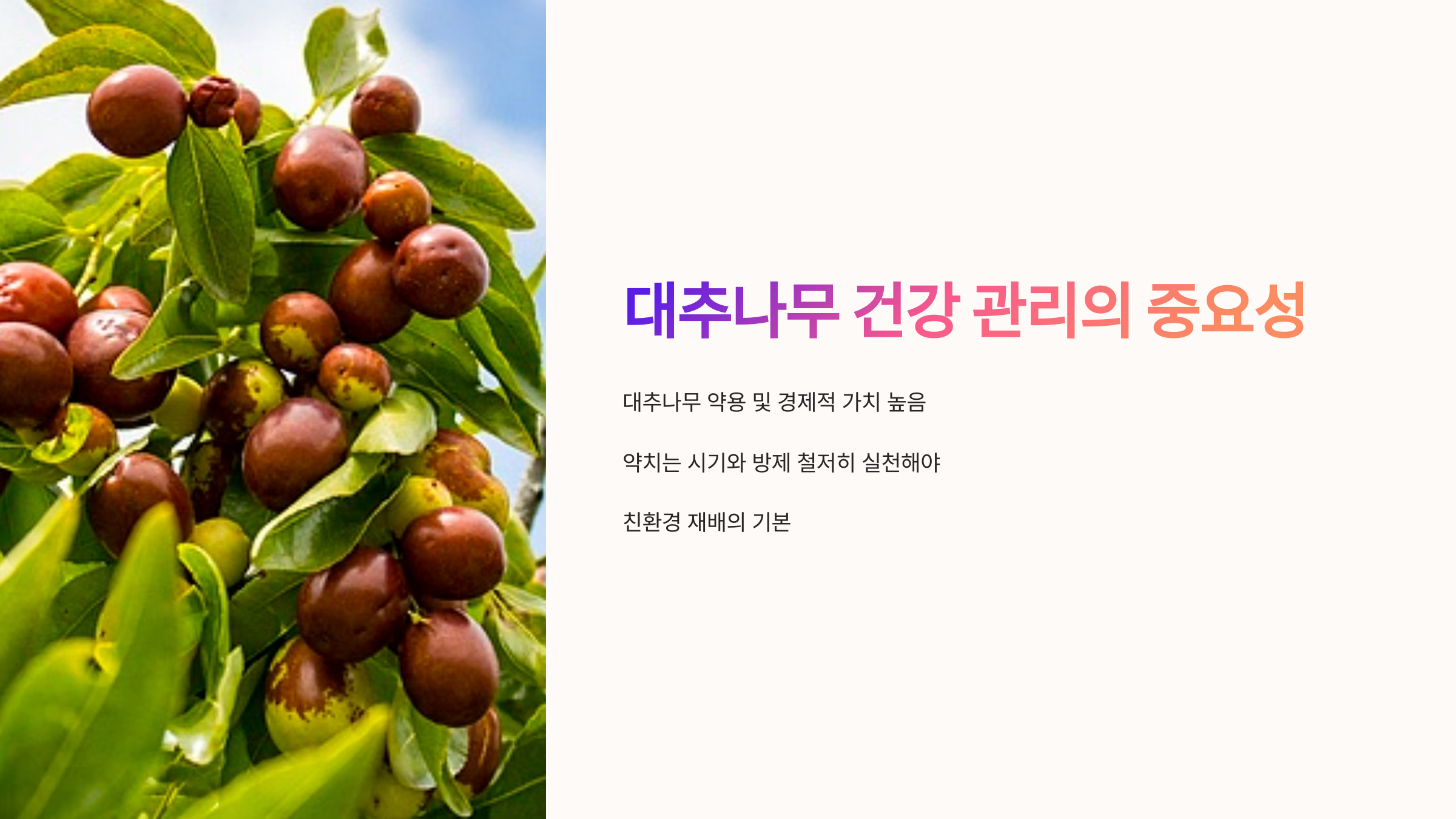 월별 스케줄을 참고해 적절한 약제를 사용하고, 탄저병, 깍지벌레, 빗자루병 같은 주요 병충해에 대비하세요. 예방과 관리가 핵심! 여러분의 대추나무가 무럭무럭 자라길 응원할게요! 😊