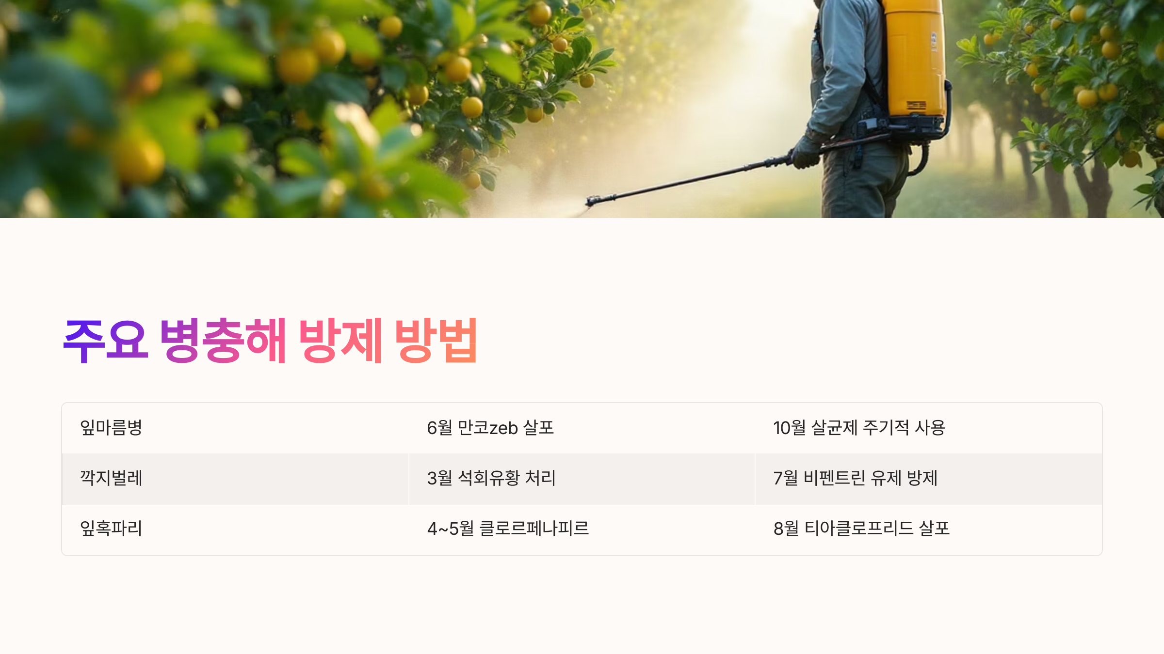 답변: 시기에 따라 다르지만, 초보자는 다목적 약제를 사용하는 게 좋아요. 예를 들어, 2~3월에는 석회유황합제로 월동 해충을 방제하고, 5~6월에는 만코zeb로 곰팡이병을 예방하세요.