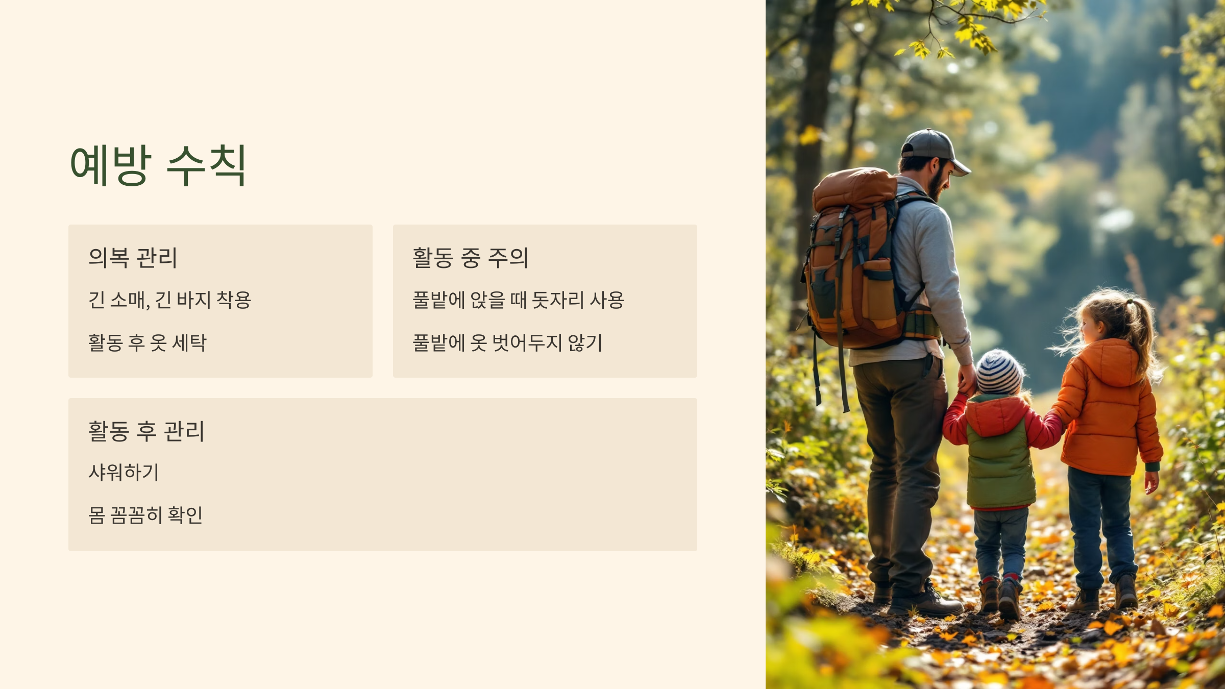 보호 복장: 긴소매, 긴바지, 발목까지 덮는 양말을 착용해 피부 노출을 최소화해요.