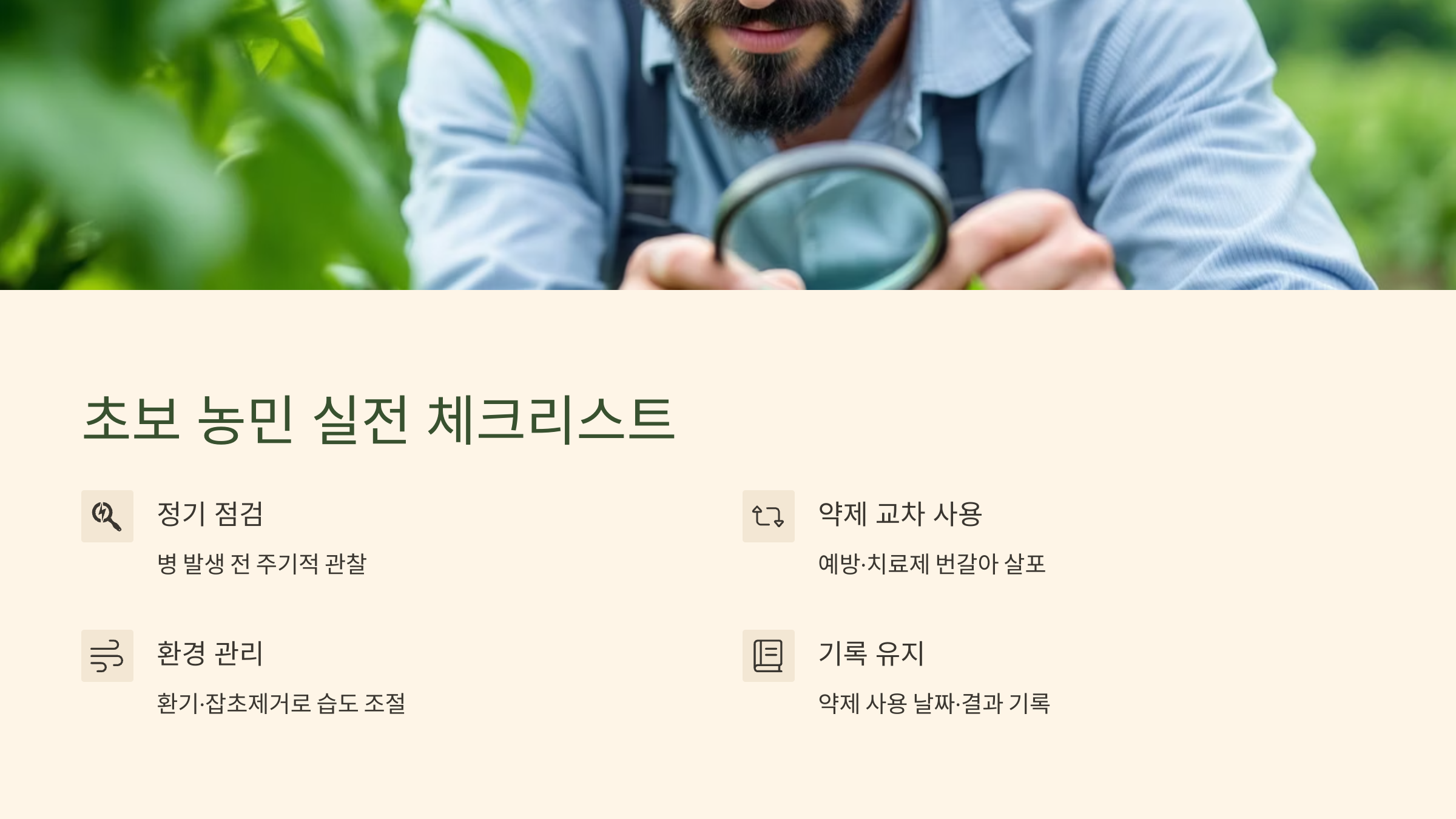 -장비 점검: 분무기 노즐이 막히지 않았는지 확인하고, 고른 분사가 되도록 조정.