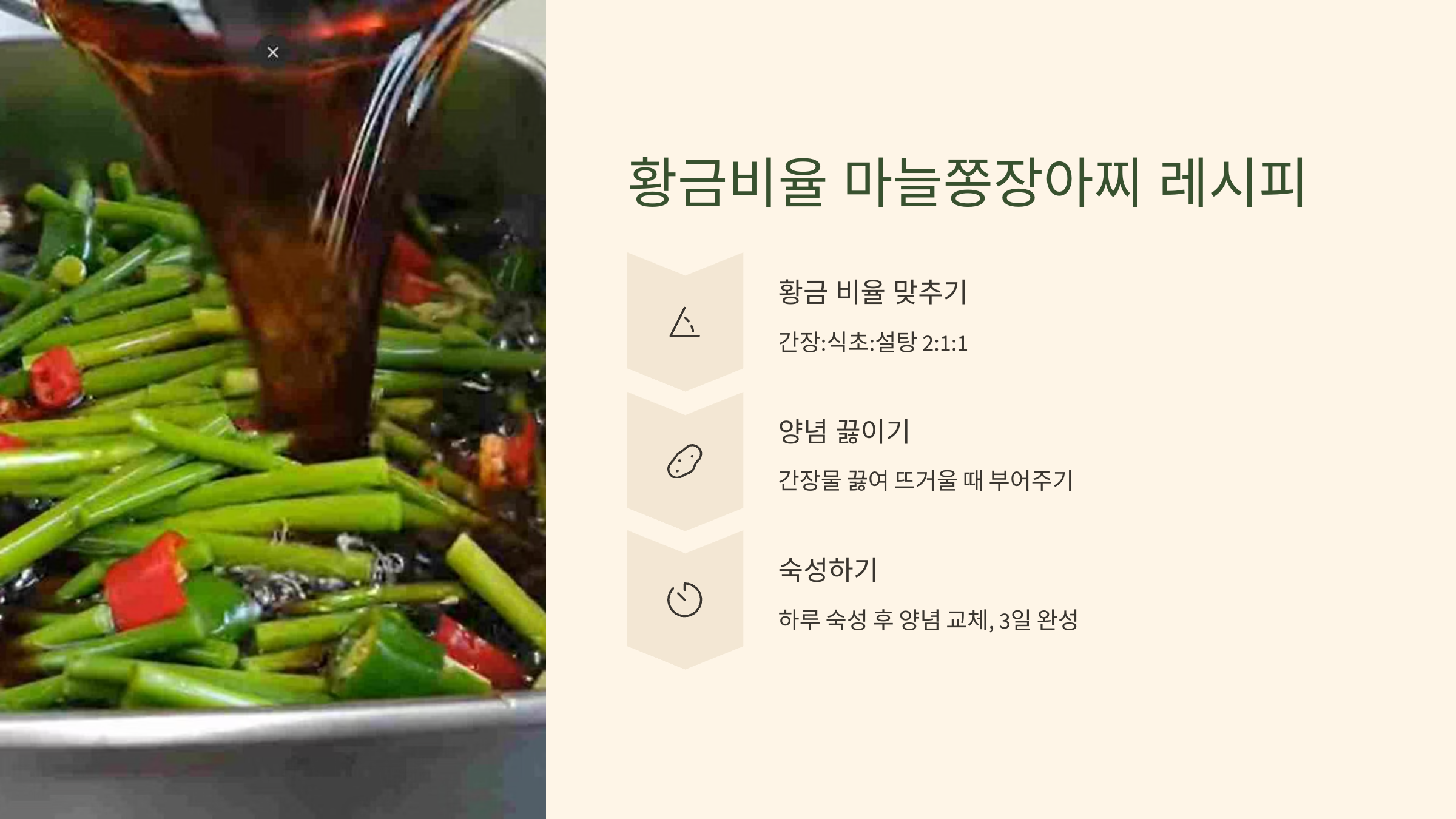 마늘쫑장아찌 맛있게 담그는법의 핵심은 바로 간장물의 비율이에요! 너무 짜거나 달지 않고, 마늘쫑의 맛을 살려주는 최적의 비율을 알려드릴게요.