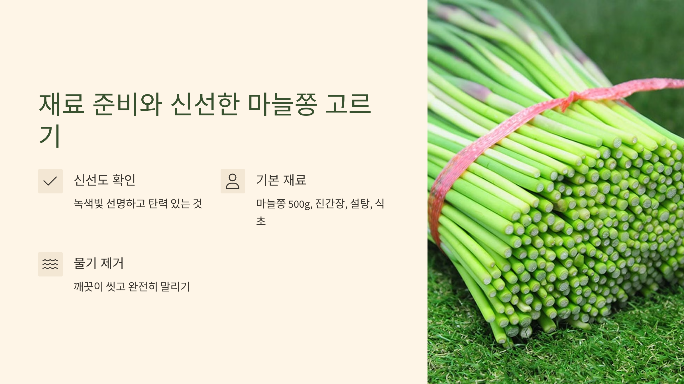 신선한 마늘쫑 선택: 연두빛이 선명하고 너무 굵지 않으며 탄력 있는 마늘쫑을 고르는 것이 아삭한 식감의 비결입니다.