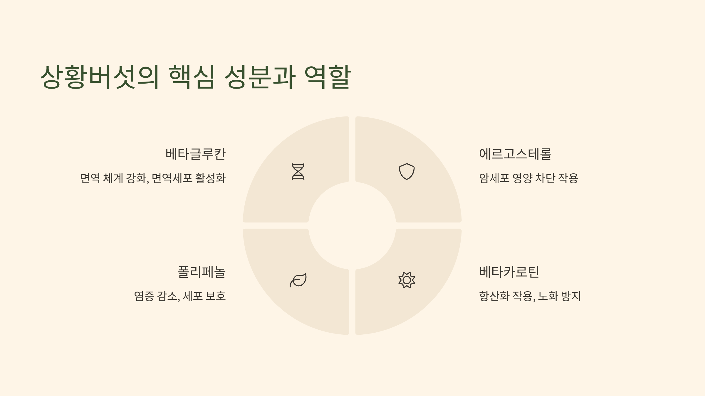 1. 면역력 증진: 베타글루칸 성분이 면역 세포의 기능을 향상시켜 신체 방어력을 높이는 데 도움을 줍니다. 이는 전반적인 상황버섯 효능 중 가장 주목받는 부분입니다.