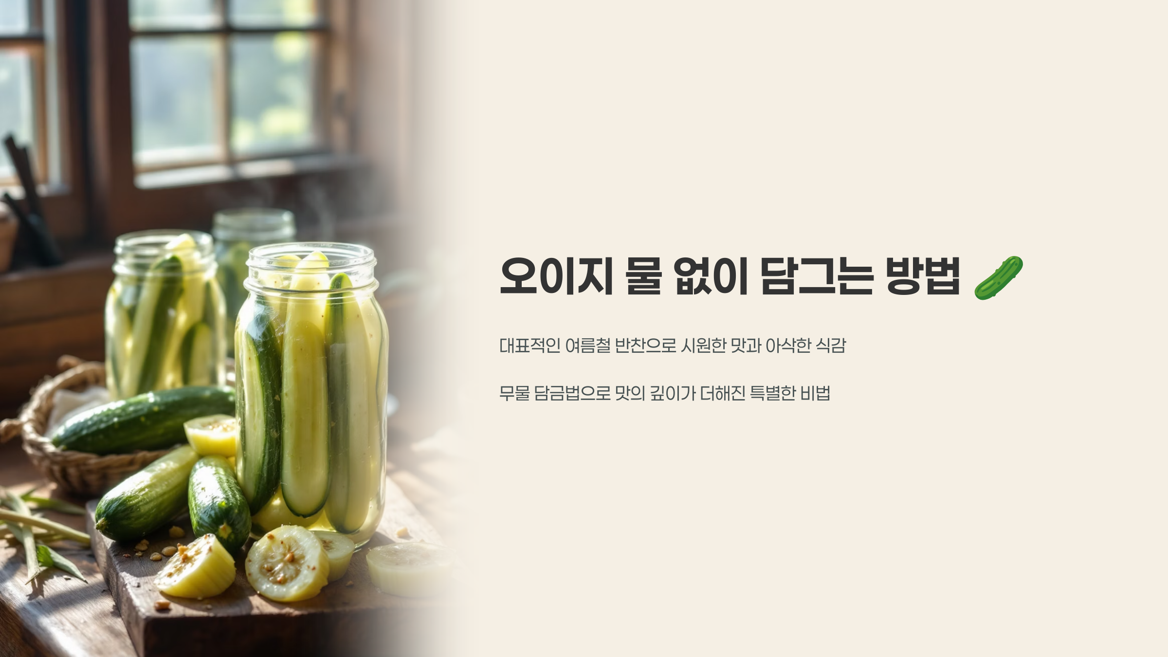 여름철 대표 반찬인 오이지는 시원하고 아삭한 식감이 매력적인 전통 발효식품입니다. 일반적으로 물에 소금을 넣어 담그는 방식이 많이 알려져 있지만, 오늘은 특별히 물 없이 담그는 방법을 소개해드리려고 합니다.