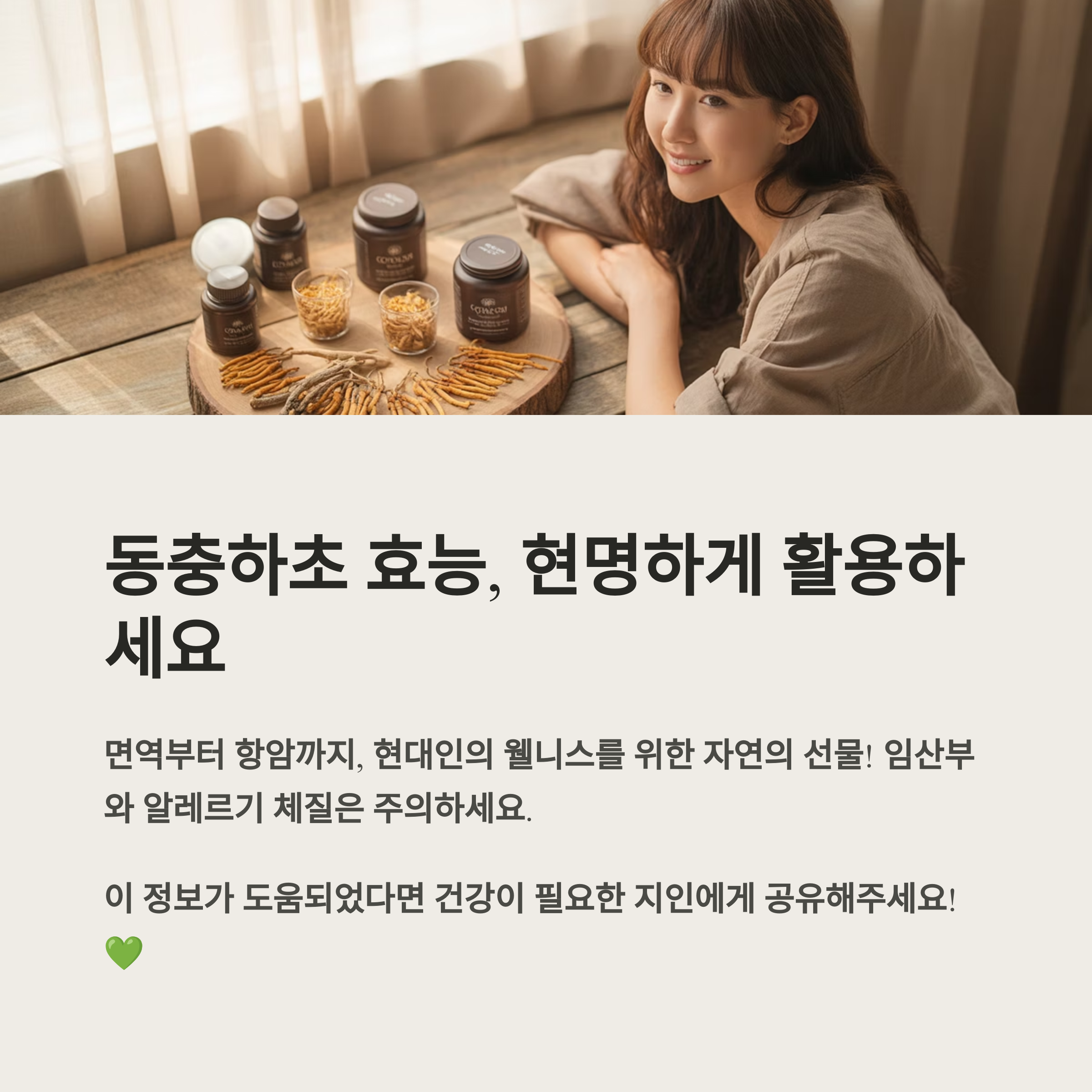 자연이 선물한 건강 보물, 동충하초의 효능을 현명하게 활용하여 더 건강한 삶을 누리시길 바랍니다.