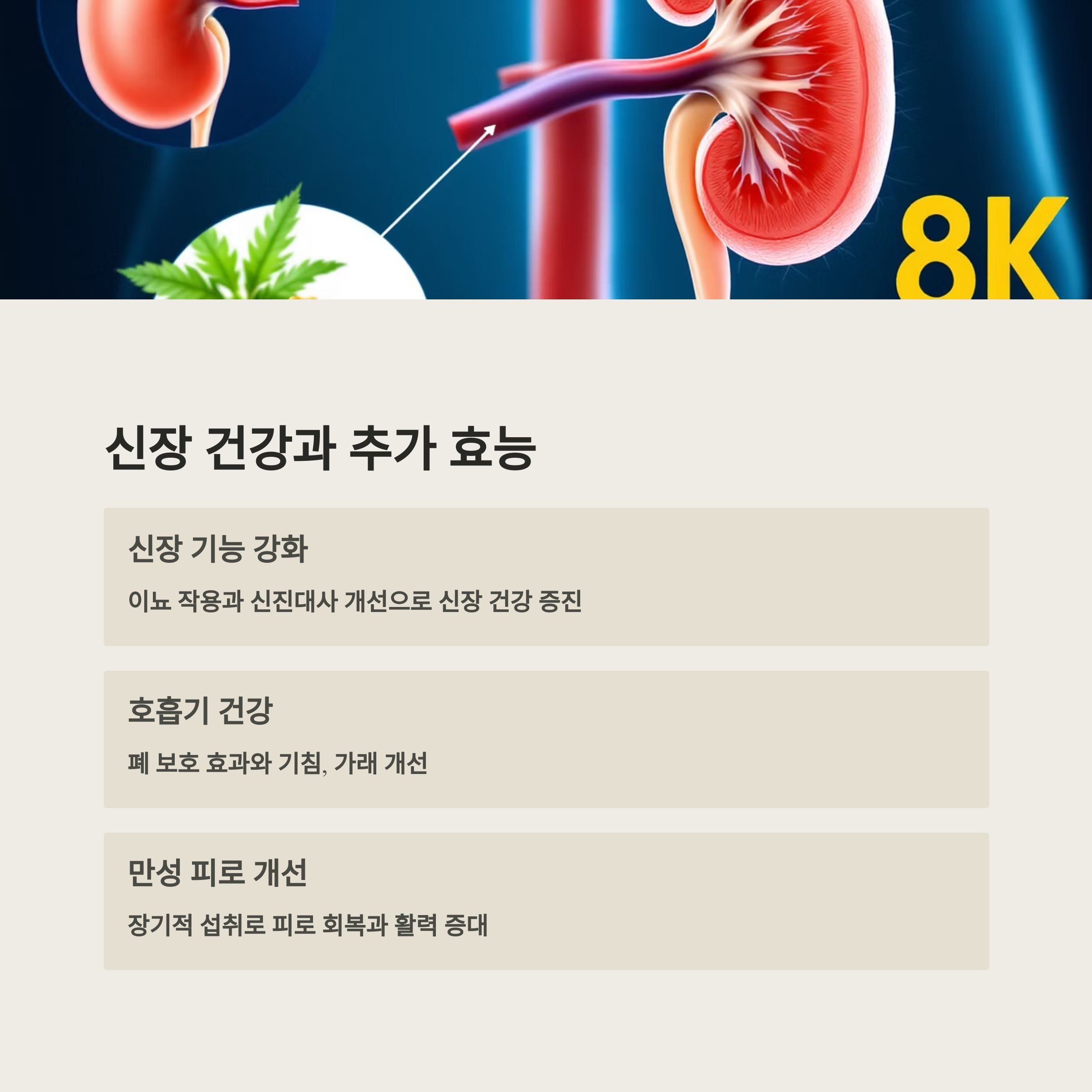 동충하초는 신장 보호 효능도 가지고 있습니다. 항산화 성분이 신장 세포의 산화 스트레스를 줄이고, 신장 기능을 유지하는 데 도움을 줍니다. 이러한 효과는 만성 신장 질환이나 당뇨병성 신증 등에서 보조적인 역할을 할 수 있습니다.