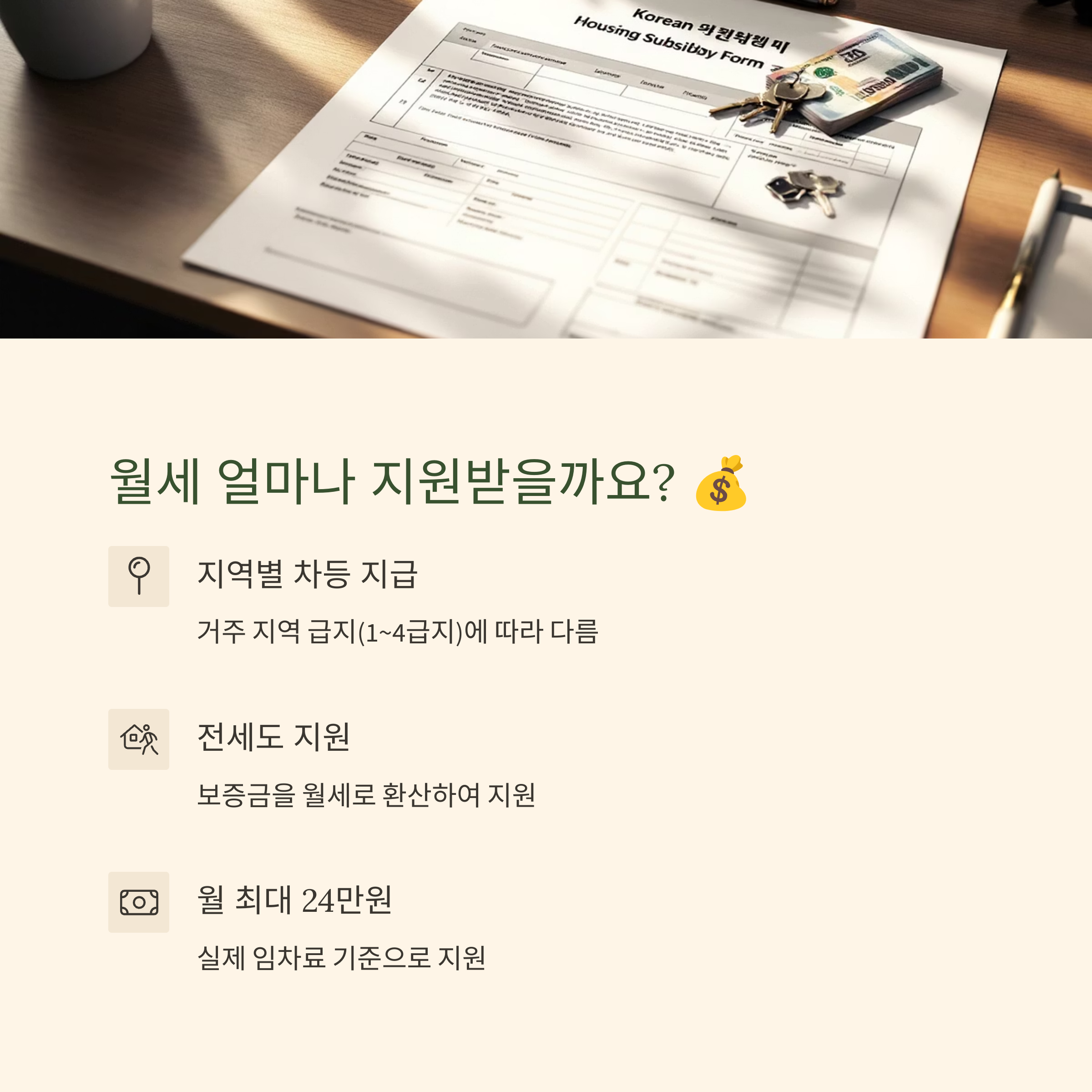 지원금액은 가구원 수와 거주 지역(급지)별로 설정된 '기준임대료'를 상한으로 합니다. 즉, 실제 월세가 기준임대료보다 적으면 실제 월세만큼, 실제 월세가 기준임대료보다 많으면 기준임대료까지만 지원됩니다.