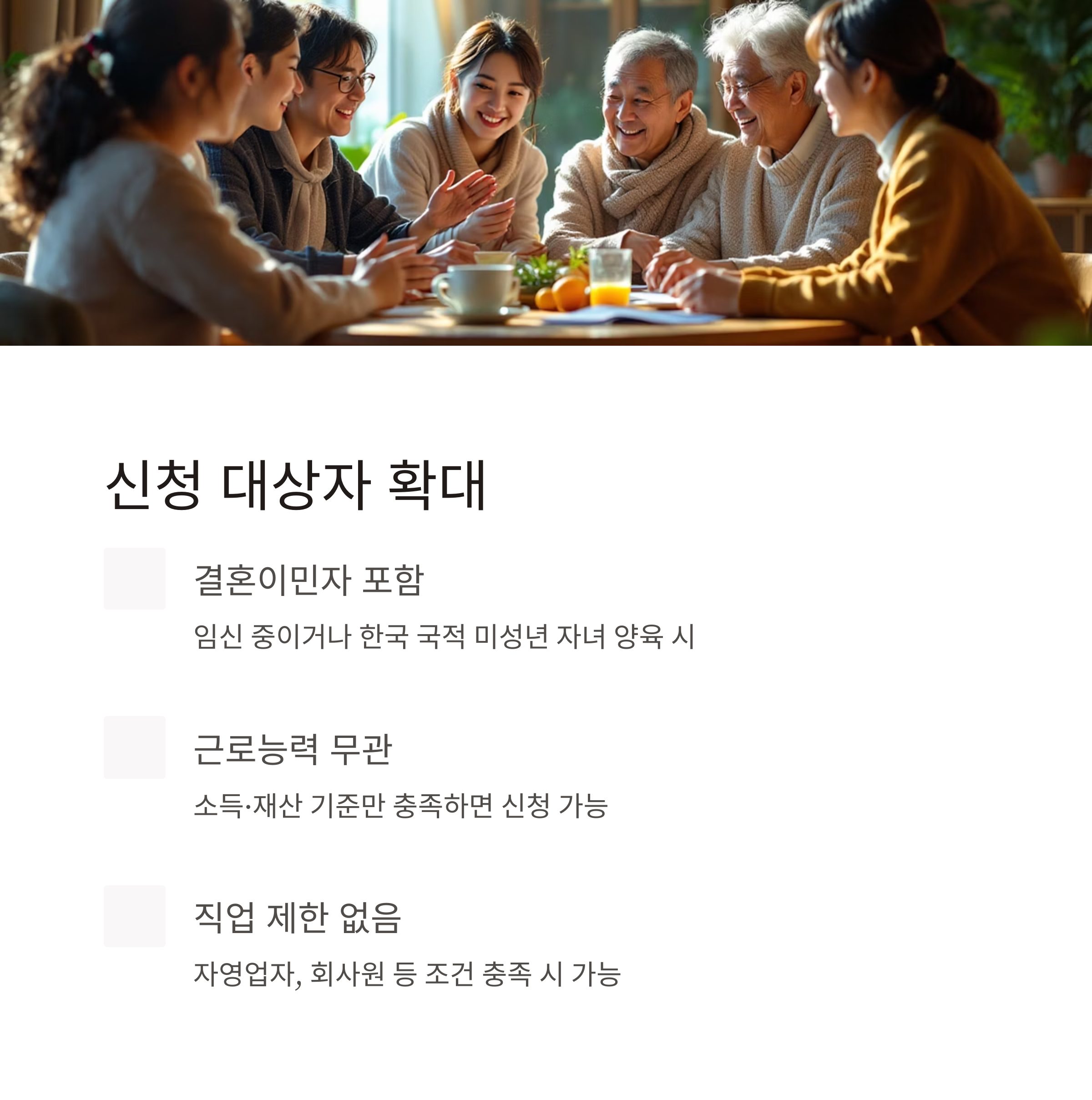 궁금한 점이 있다면 주저하지 마시고 거주지 주민센터나 보건복지상담센터(국번없이 129)에 문의하여 정확한 안내를 받으시길 바랍니다.