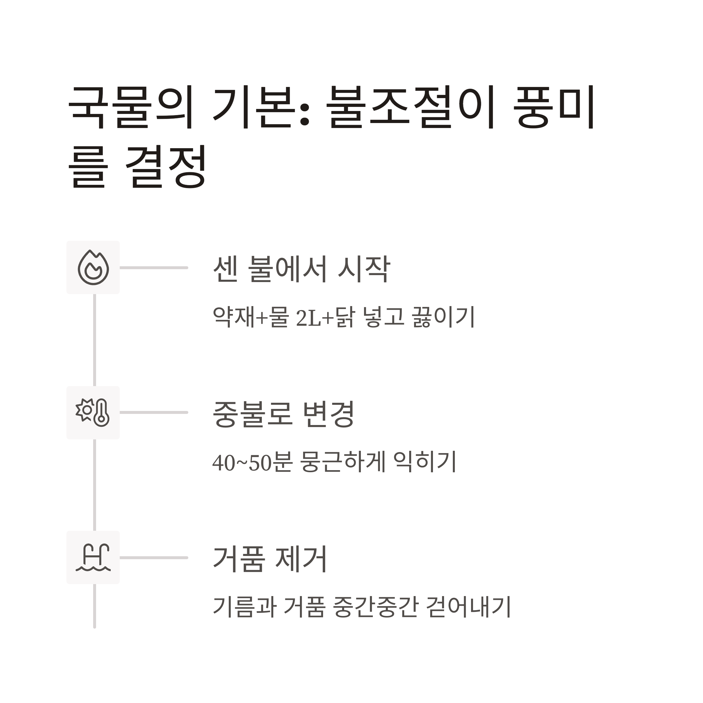 마지막 한 스푼: 다 끓인 후, 닭에서 나온 기름을 살짝 걷어내면 더욱 깔끔한 맛을 즐길 수 있습니다.