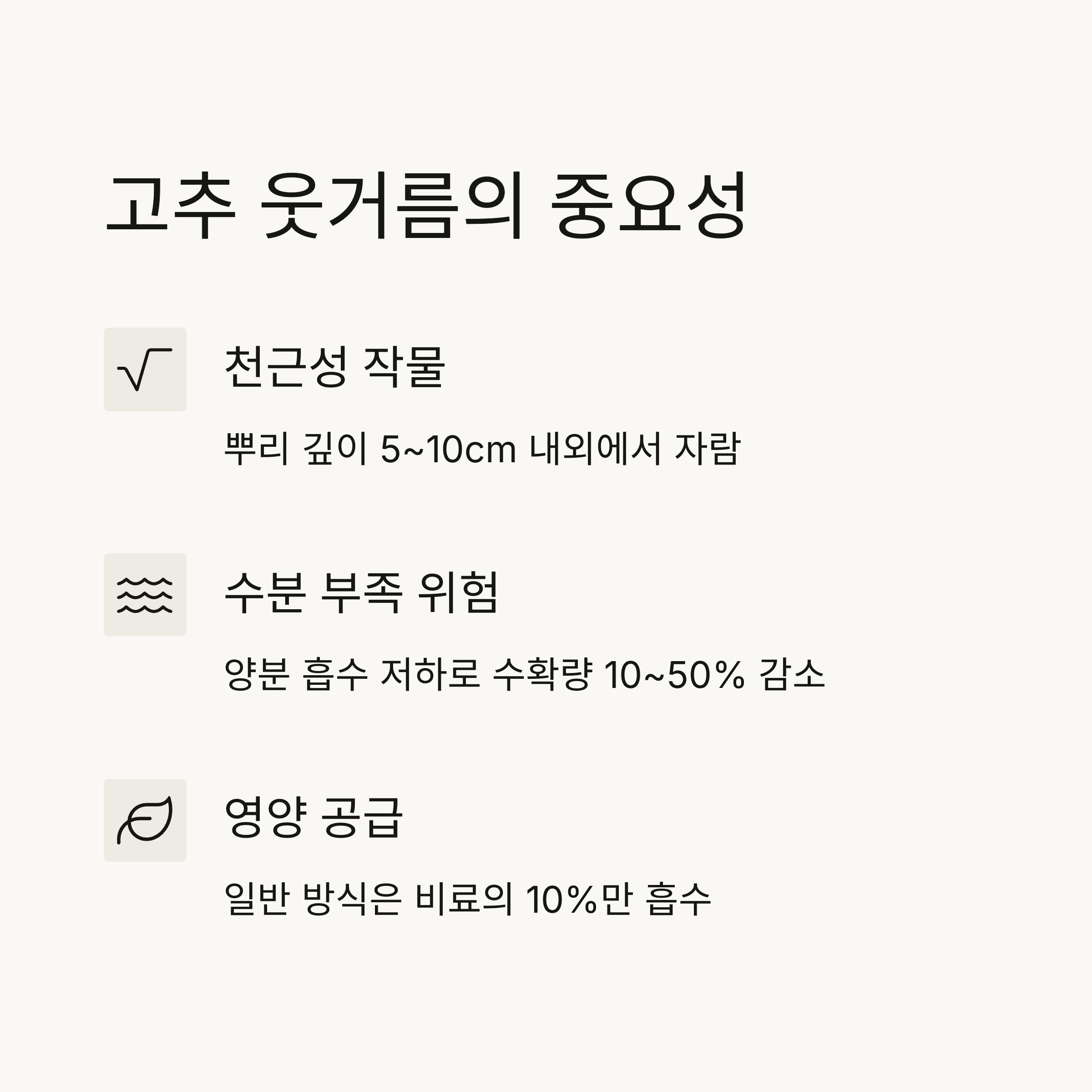 탐스럽고 품질 좋은 고추를 키우기 위해서는 적절한 영양 공급이 필수입니다. 특히 고추 생육 기간 동안 부족한 양분을 보충해주는 '웃거름(추비)'은 고추의 성장과 결실에 큰 영향을 미치죠.