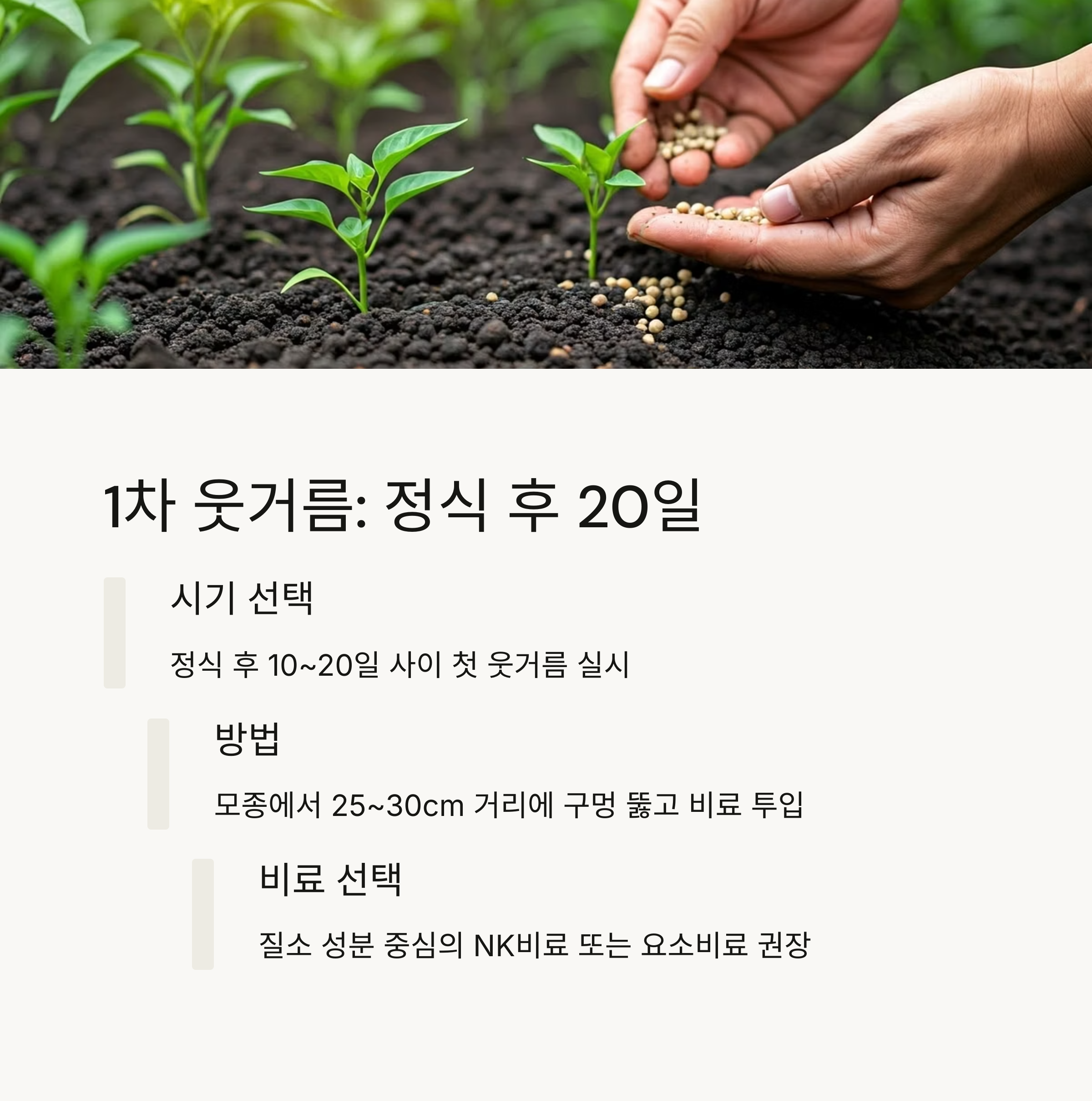 고추는 비교적 오랜 기간 동안 재배되는 작물로, 밑거름만으로는 전체 생육 기간에 필요한 양분을 모두 충족하기 어렵습니다. 이 때문에 생육 중간중간에 추가로 비료를 공급하는 웃거름 작업이 매우 중요합니다.