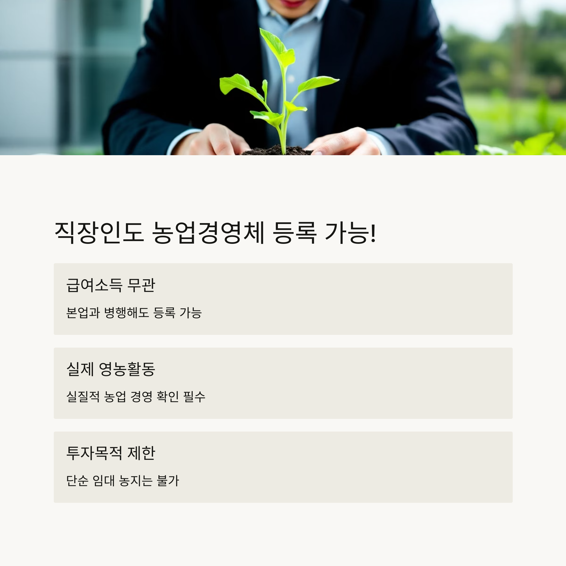 결론부터 말씀드리면, 직장인도 **농업경영체 등록 조건**을 충족하면 등록이 가능합니다. 다만, 농업 외 소득이 일정 기준을 초과하면 제한이 따를 수 있습니다.