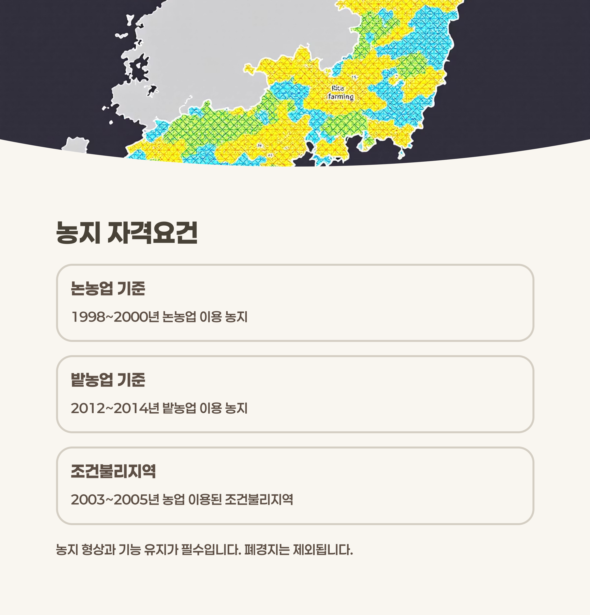 형에 따라 세부 조건이 다릅니다. 기본적으로 농업경영체 등록이 필수이며, 농지의 적법한 소유 또는 임차 관계가 확인되어야 합니다. 2025년 기준 주요 신청자격은 다음과 같습니다: