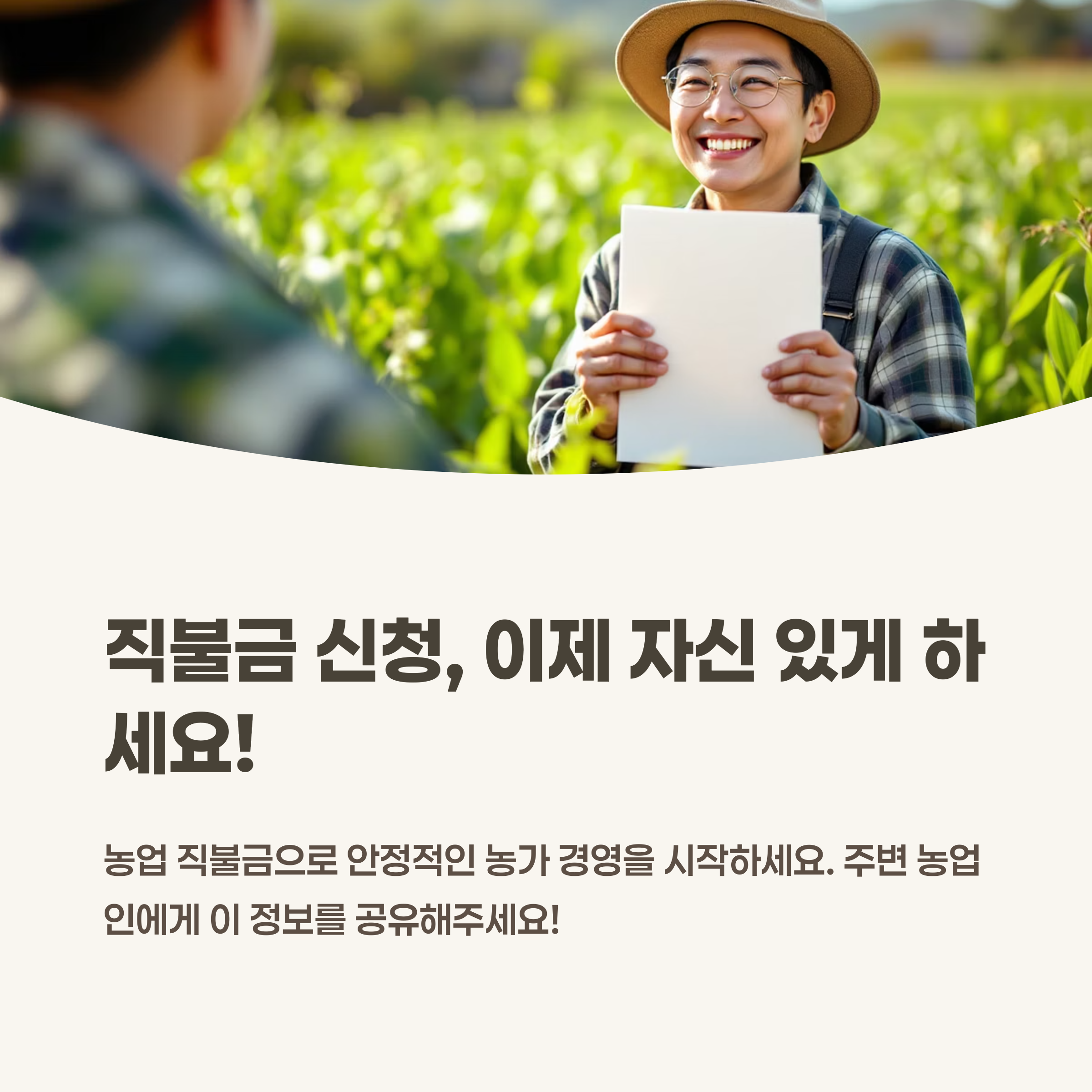 농업 직불금은 농업인의 소득 안정화와 농업의 공익적 기능을 위한 중요한 제도이니, 자격 요건을 충족하는 농업인이라면 반드시 신청하여 혜택을 받으시기 바랍니다.
