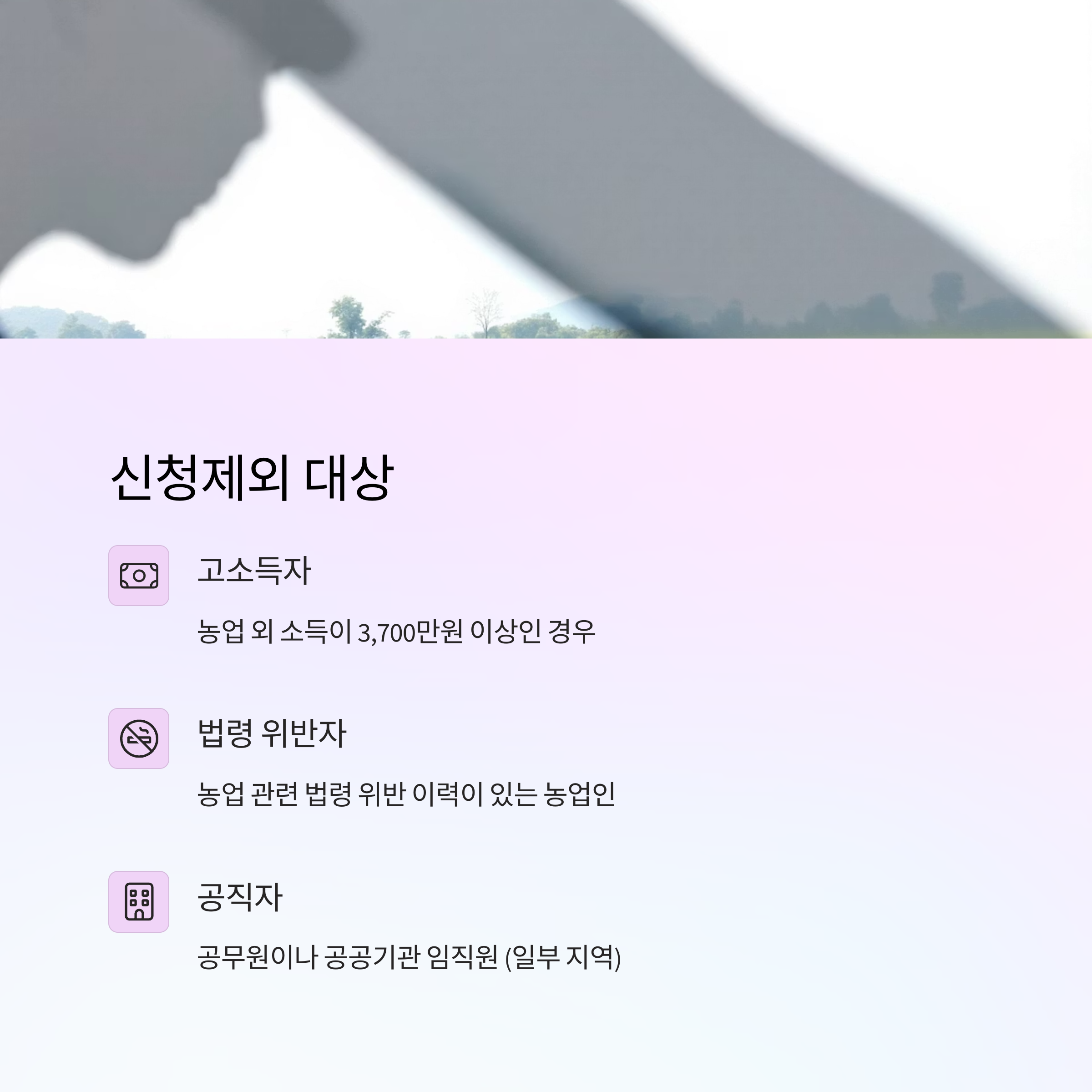 -농업 외 소득이 일정 금액 이상인 경우 지원 대상에서 제외될 수 있습니다.