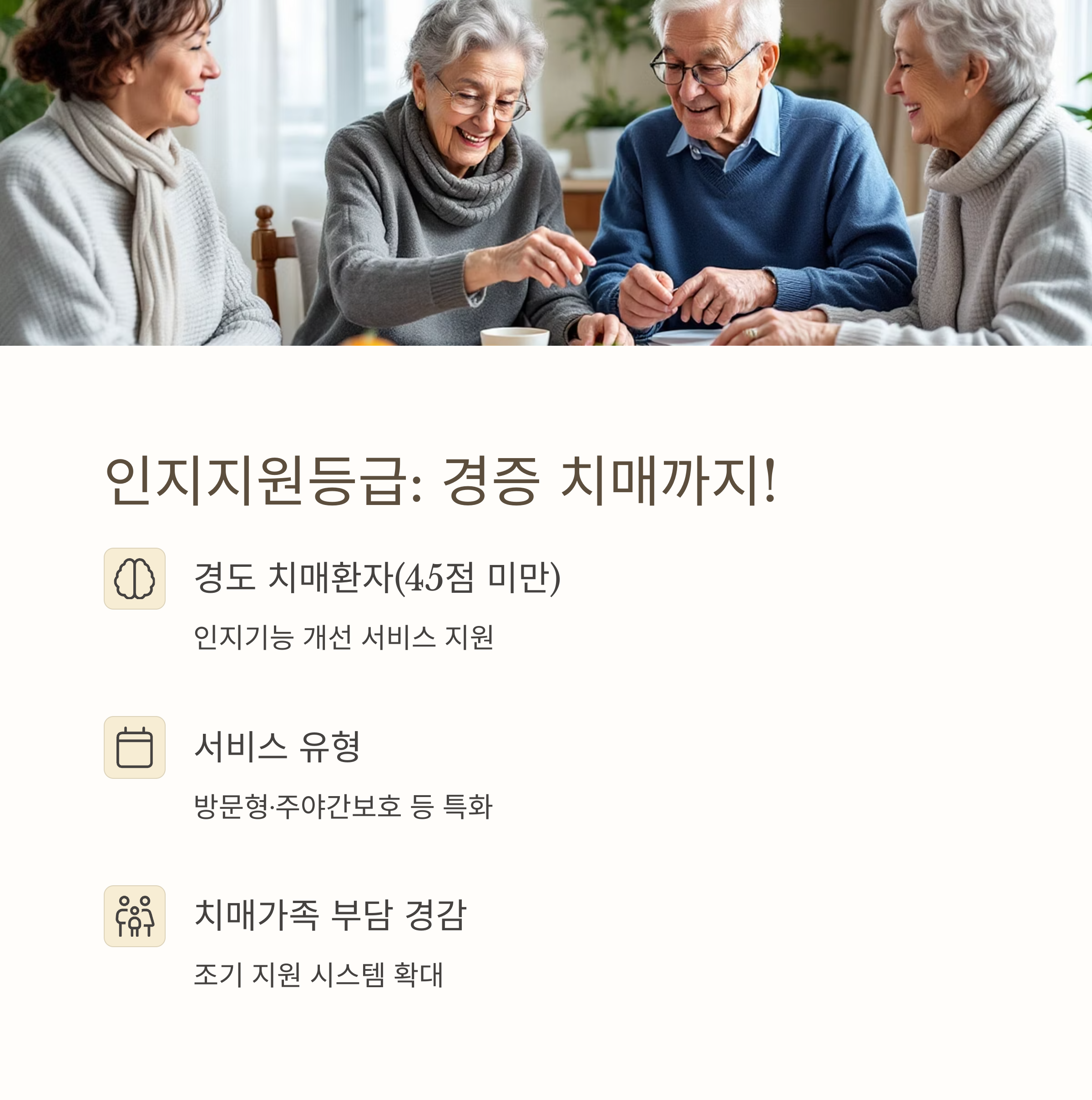 | 인지지원등급 | 치매환자로서 신체 기능과 관계없이 장기요양보험법 시행령으로 정하는 인지지원 서비스를 제공받아야 하는 자 (경증치매 어르신) | 재가급여 (주야간보호시설에서 인지기능 개선 프로그램, 치매안심센터 서비스 연계) |