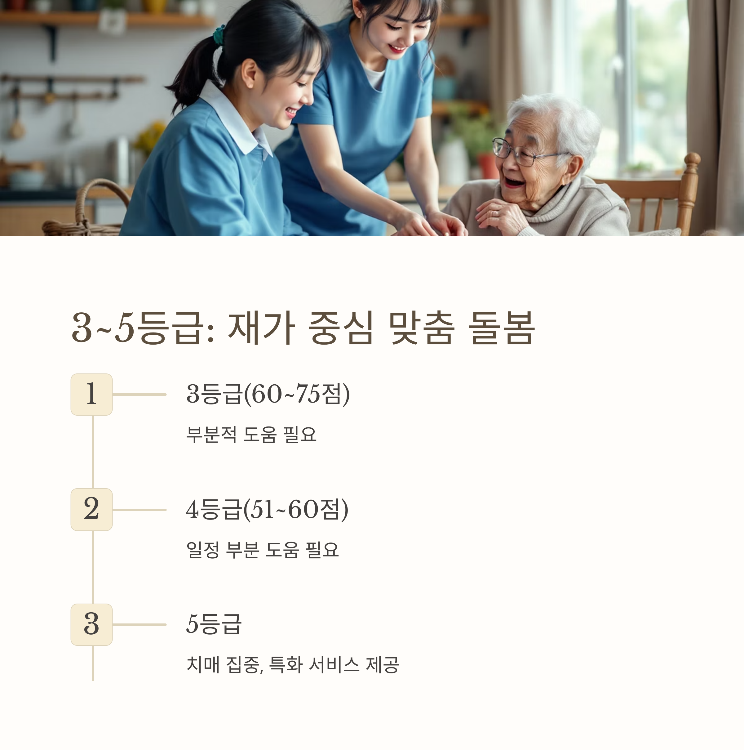 | 3등급 | 심신의 기능장애로 일상생활에서 부분적으로 다른 사람의 도움이 필요한 자 | 재가급여 중심 (방문요양, 복지용구, 주야간보호 등 월 한도액 내 이용) |