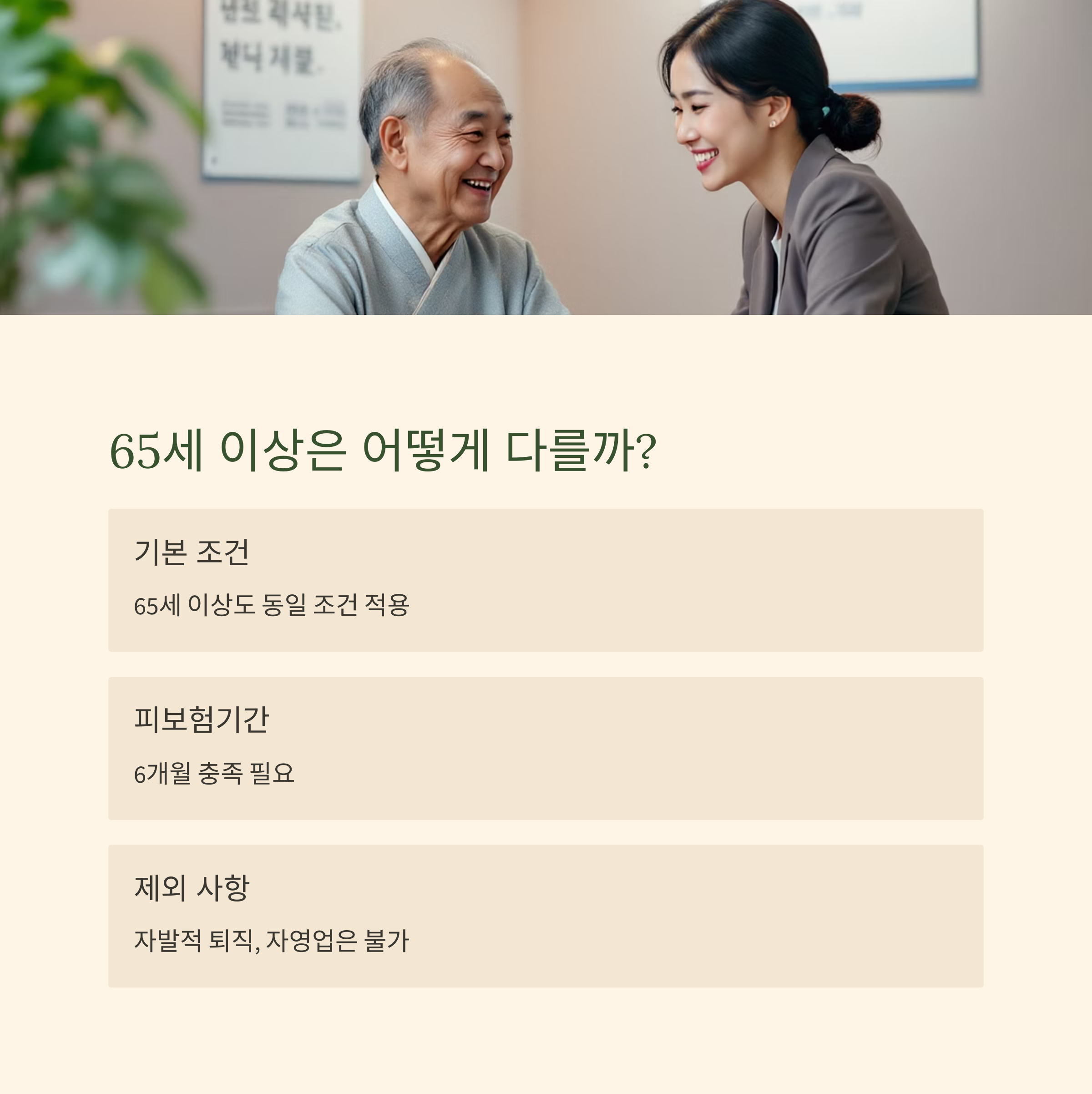 65세 이상 어르신들의 경우, 실업급여 나이조건에 대해 궁금해하시는 분들이 많습니다. 원칙적으로 65세 이후에 새롭게 고용되거나 자영업을 개시한 분은 실업급여 적용 대상에서 제외됩니다.