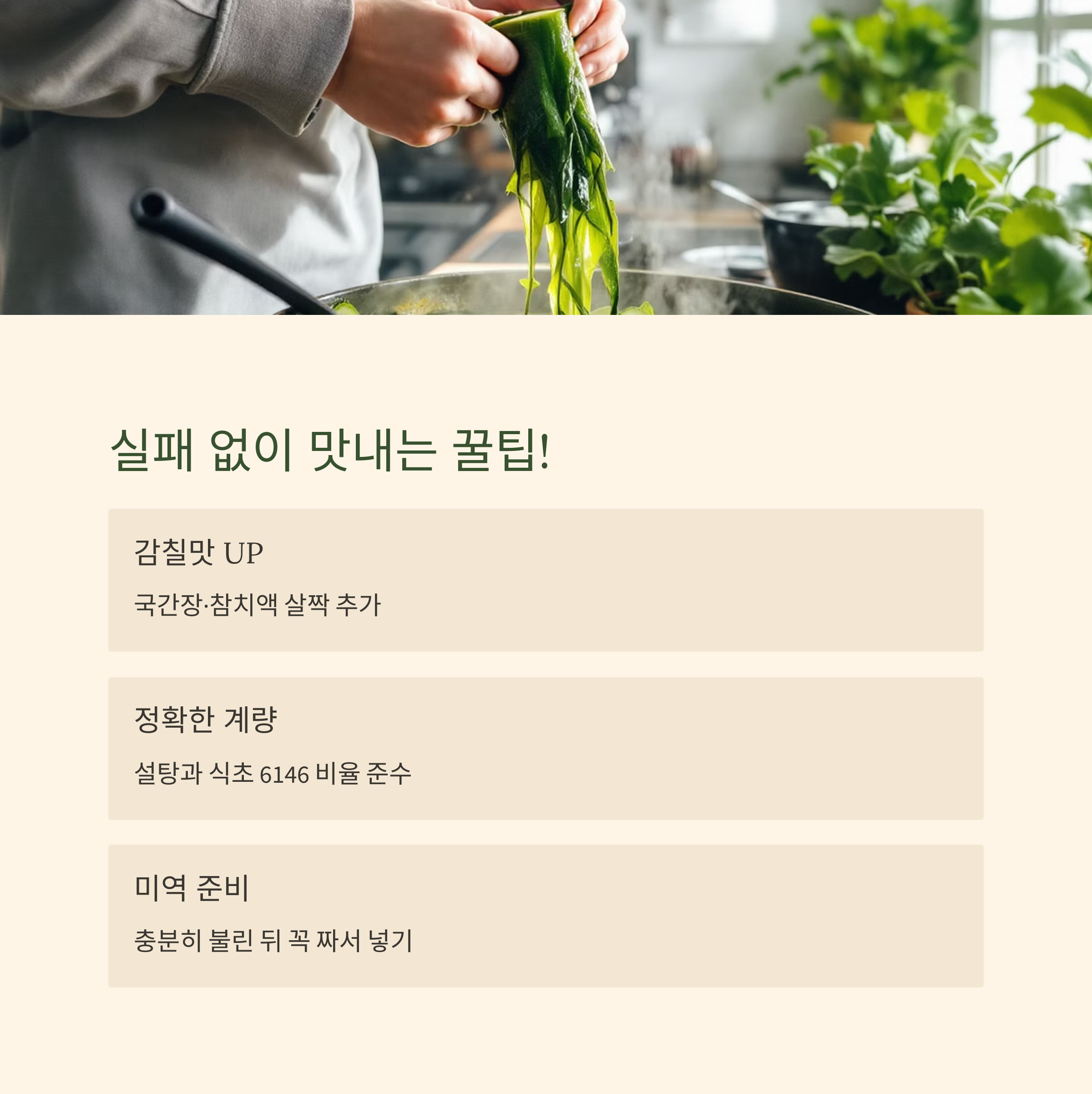 -미역 비린내 제거: 불린 미역을 끓는 물에 살짝 데쳤다가 찬물에 헹궈 사용하면 비린 맛을 줄일 수 있어요.