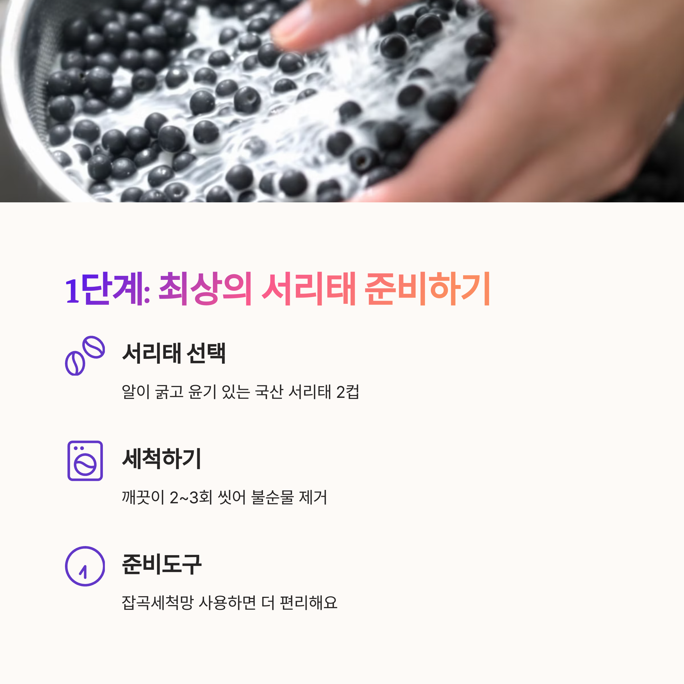 모든 요리의 시작은 좋은 재료 선택이죠! 서리태 콩물두유 만들기의 첫걸음도 마찬가지입니다. 윤기가 흐르고 알이 굵은 국산 서리태를 준비해주세요.