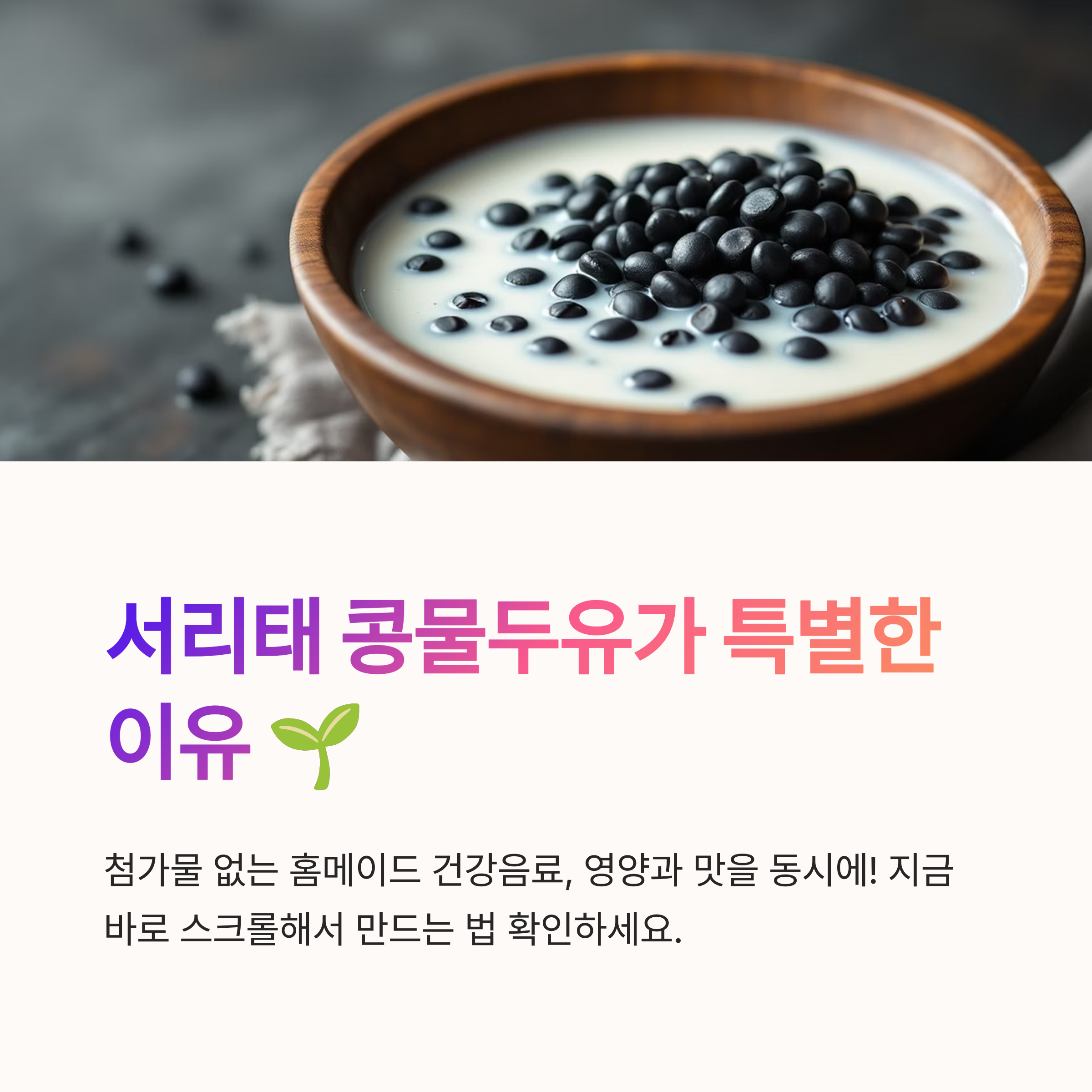 첨가물 걱정 없이 온 가족이 함께 즐길 수 있는 건강 음료, 서리태 콩물두유로 활기찬 하루를 시작해보시는 건 어떨까요? 여러분의 건강한 식생활을 응원합니다! 😊 꾸준한 서리태 콩물두유 만들기로 건강한 습관을 들여보세요.