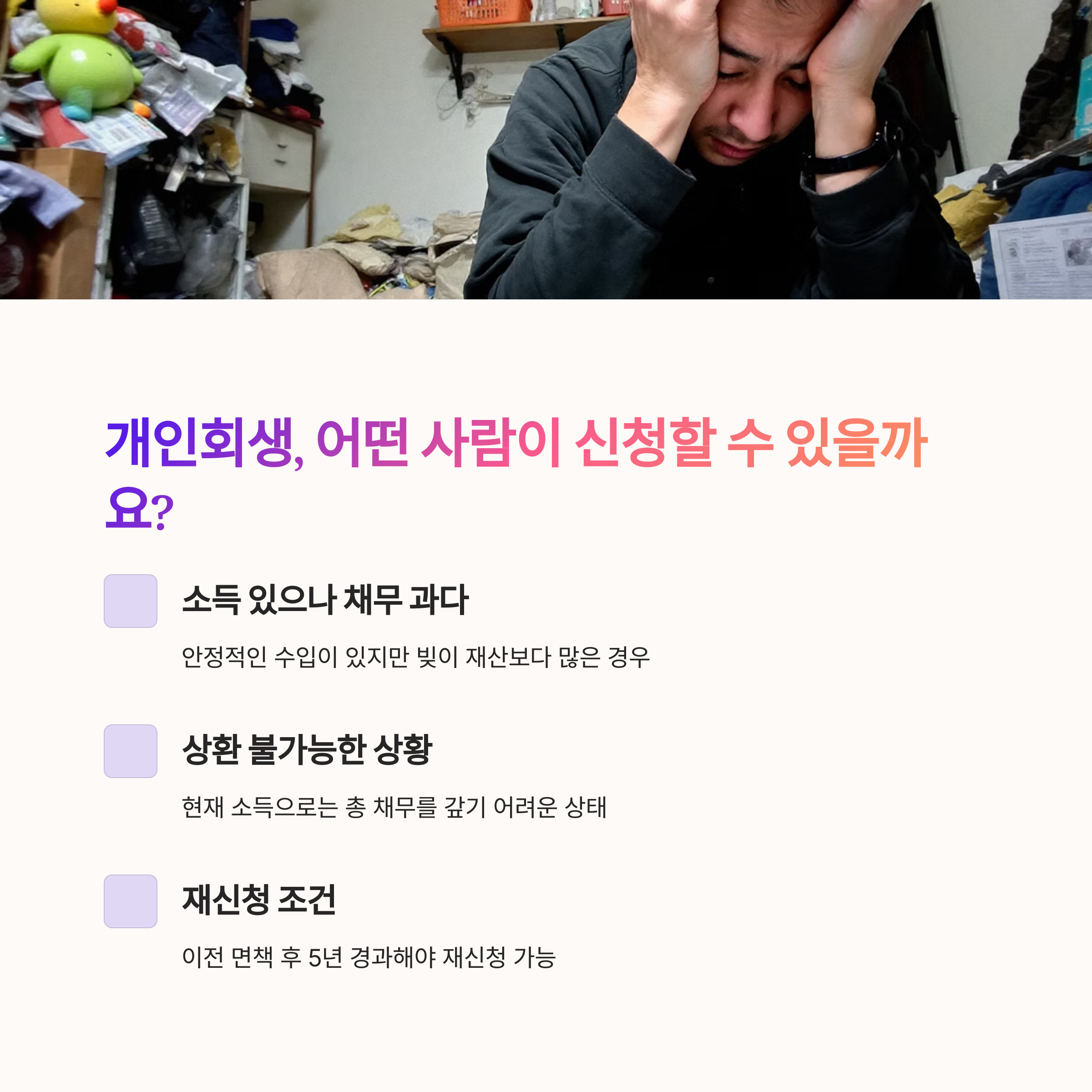 개인회생을 신청하기 위한 기본적인 자격 요건들이 있습니다. 물론 개개인의 상황에 따라 세부적인 판단은 달라질 수 있지만, 아래 조건들을 충족하는지 먼저 살펴보세요.