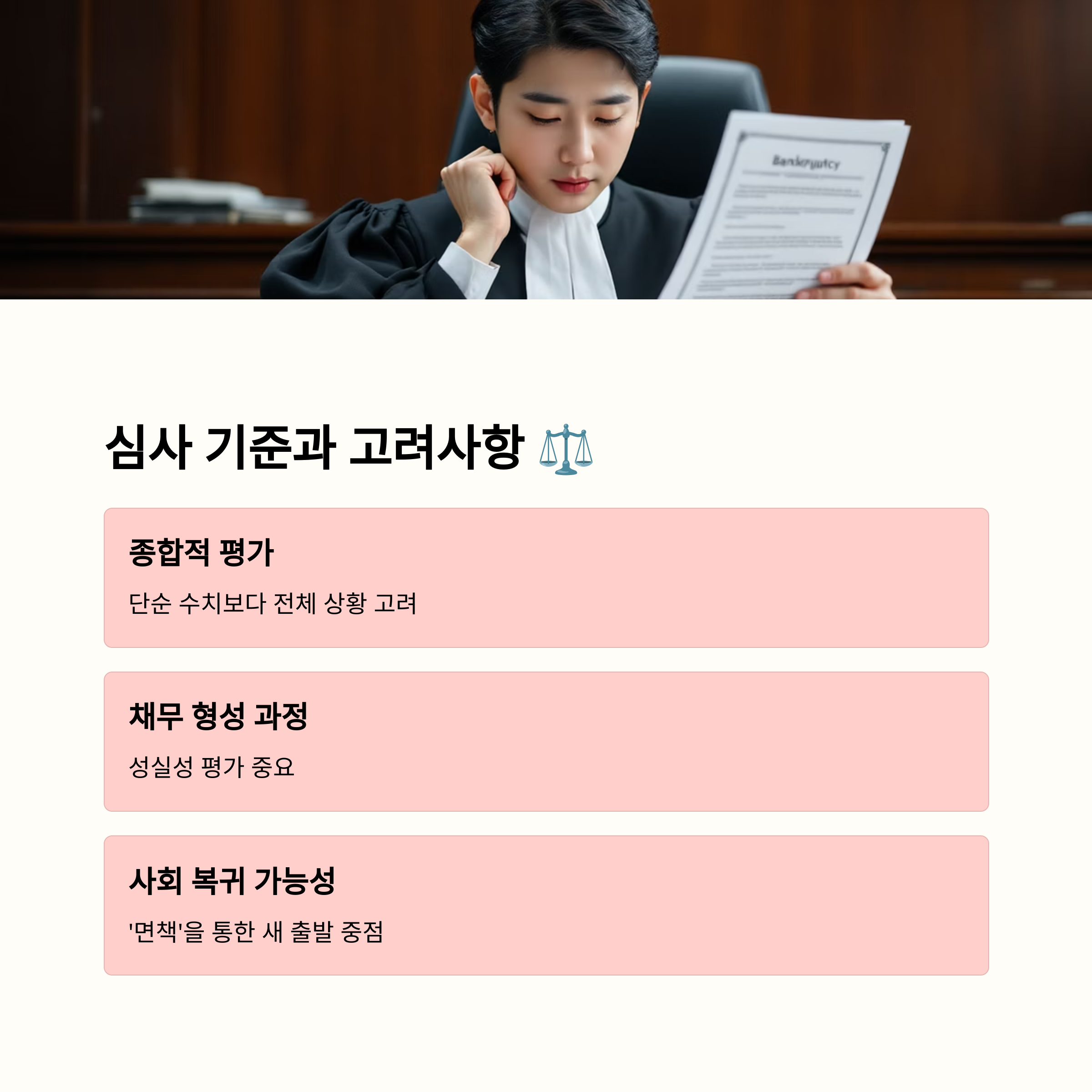 ✅ 면책불허가 사유 부존재: 파산 신청 전 재산을 숨기거나, 특정 채권자에게만 몰래 변제하는 등의 행위, 또는 낭비나 도박으로 재산을 탕진한 경우에는 면책(빚 탕감)이 불허될 수 있습니다. 성실하지만 불운한 채무자를 구제하기 위한 제도임을 기억해야 해요.