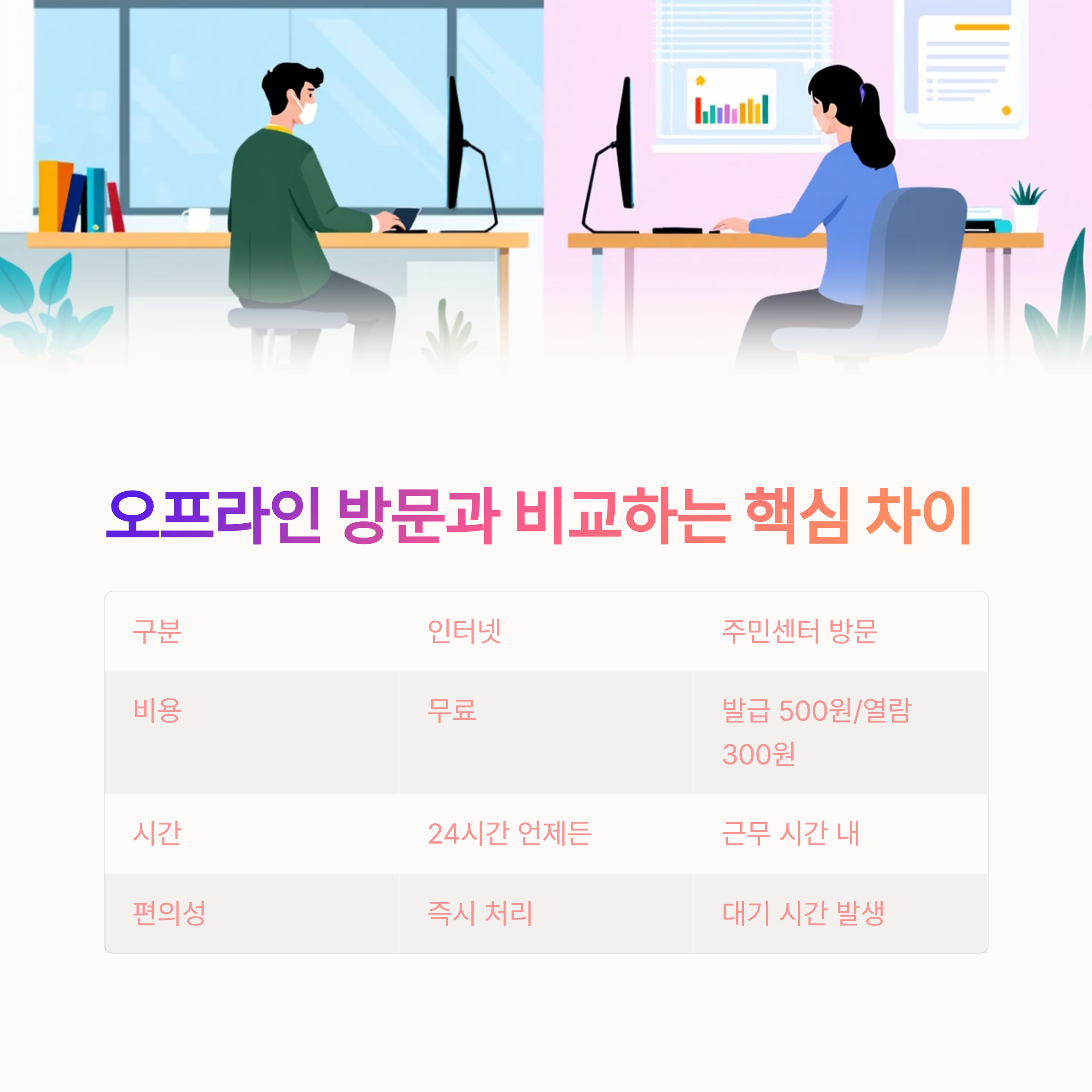 | 형태 | 화면으로 조회 (프린터로 인쇄 가능) | 전자문서(PDF) 또는 종이 출력물 (원본대조필 등 표시) |