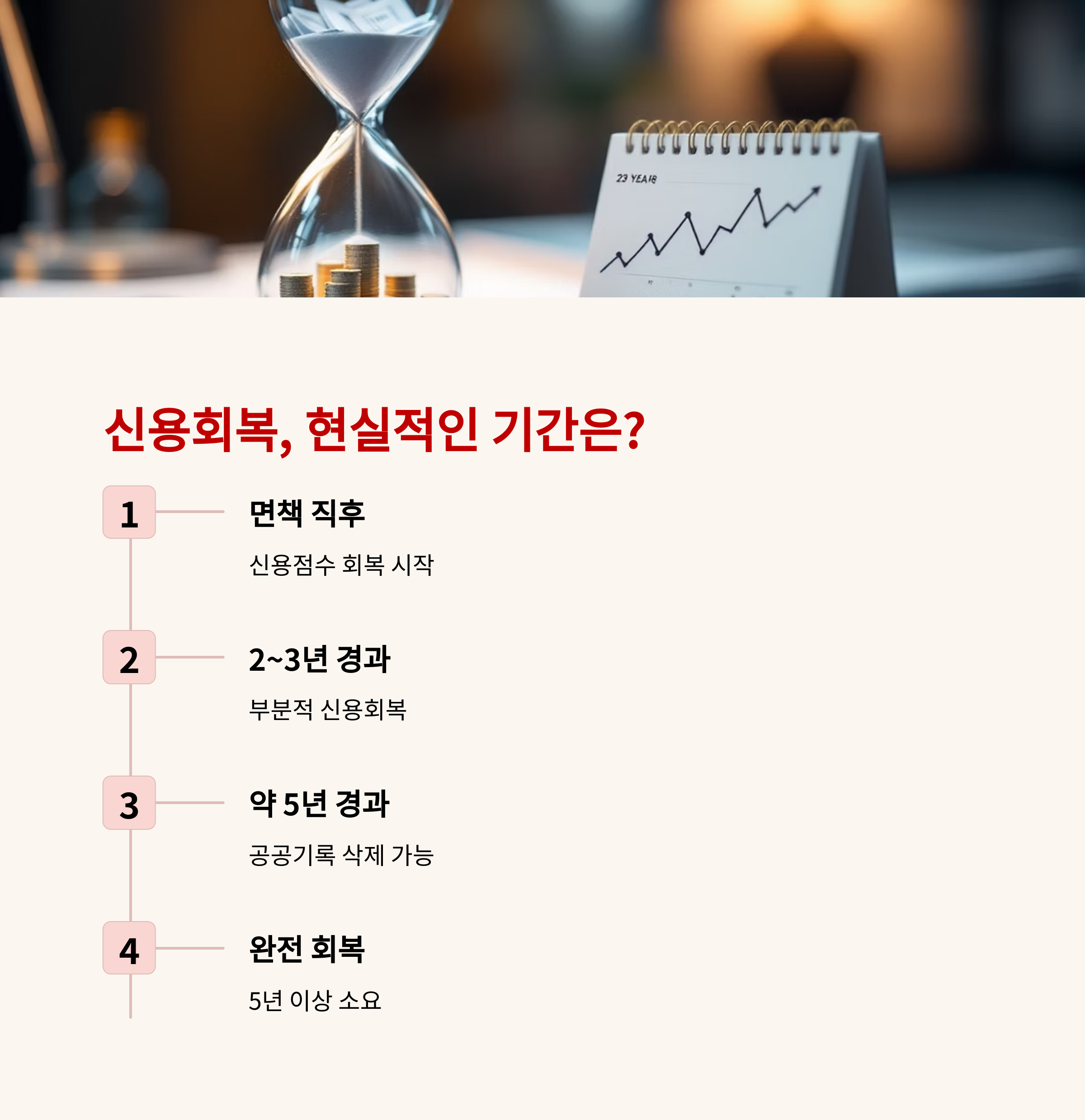 본격적인 신용회복 2년~5년 신용점수 점진적 상승, 금융거래 폭 확대, 기록 삭제 시점 도래