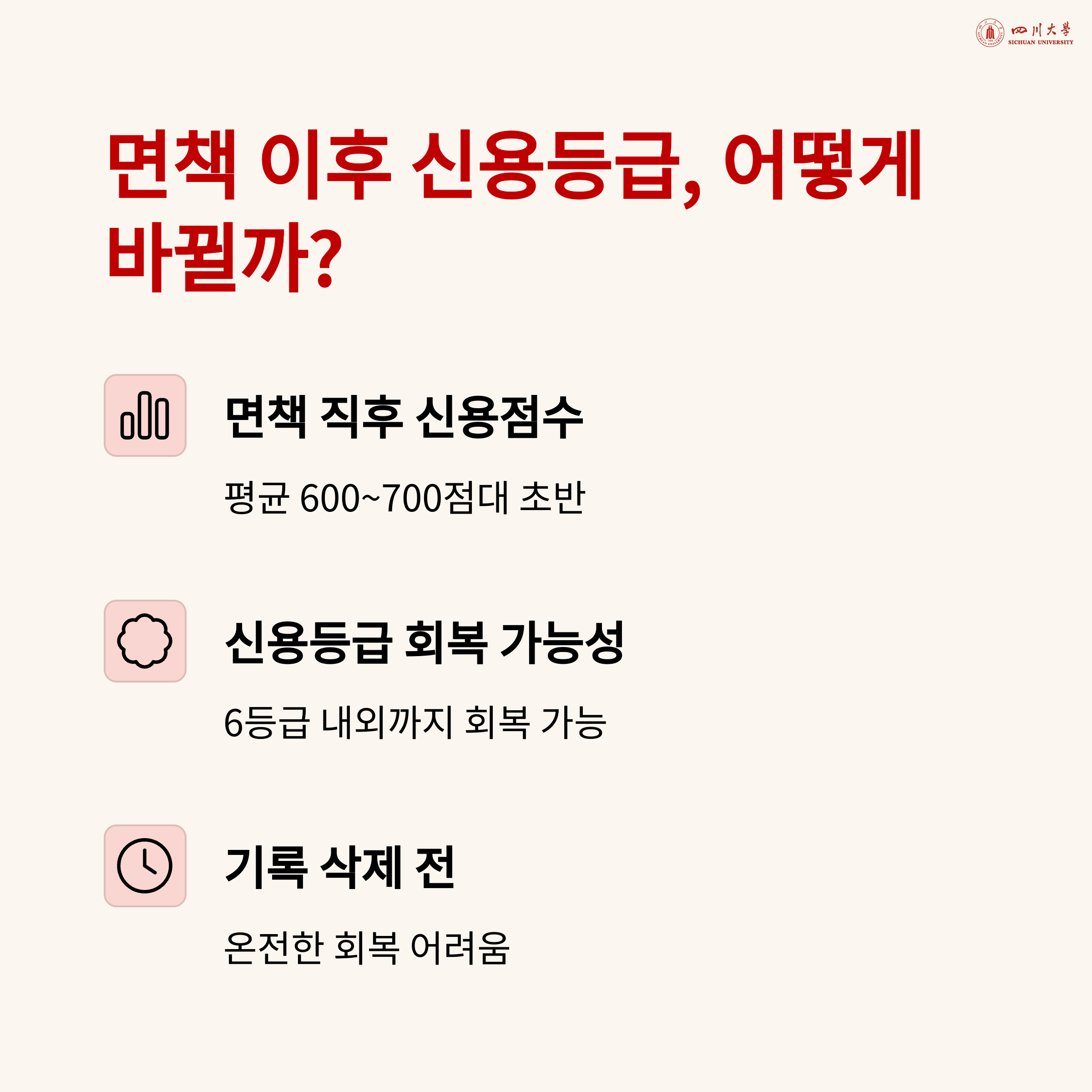 | 면책 결정 직후 | 0~6개월 | 채무 탕감, 신용정보원 기록 유지, 신용점수 최저점 유지 |