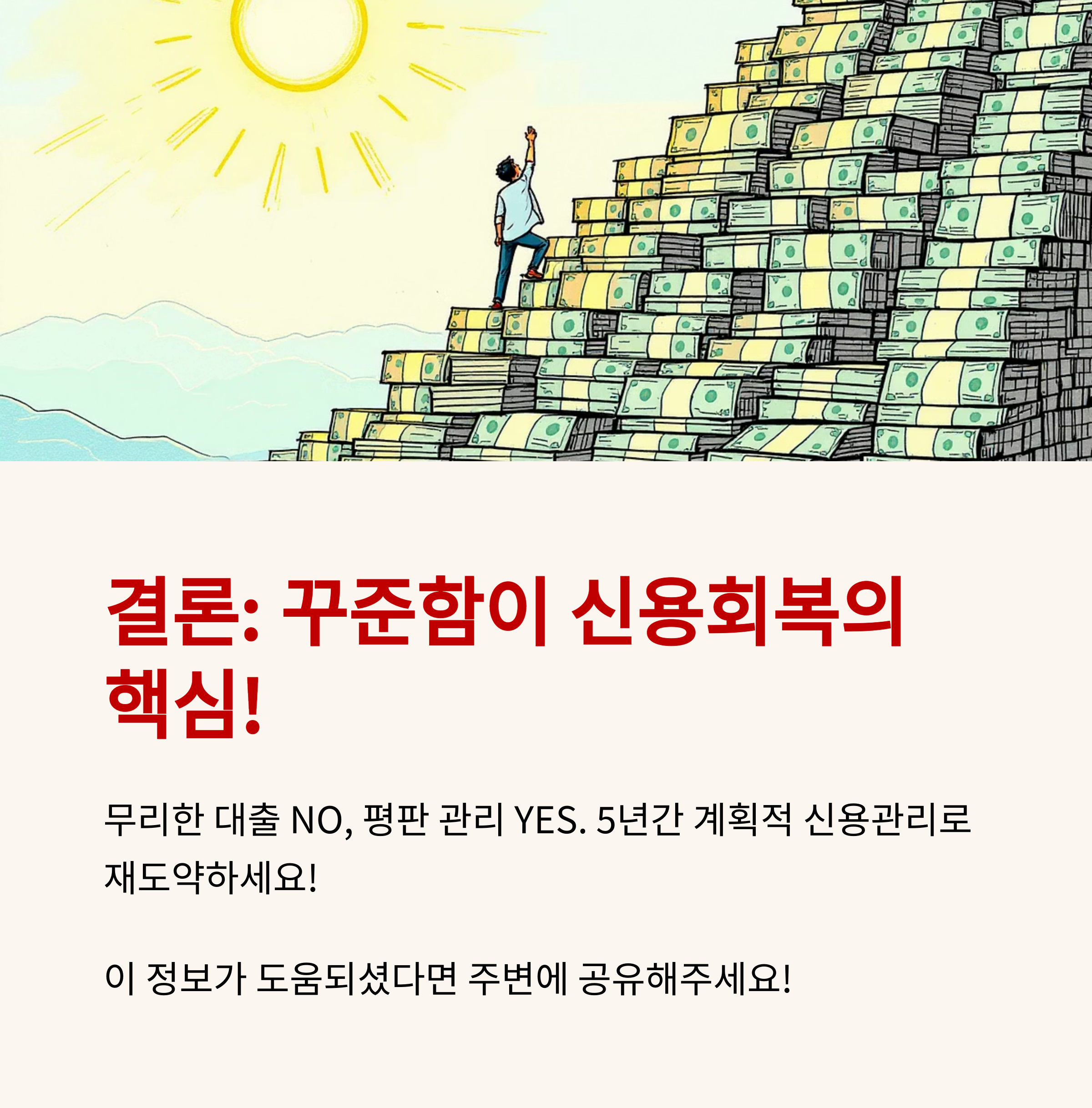 | 본격적인 신용회복 | 2년~5년 | 신용점수 점진적 상승, 금융거래 폭 확대, 기록 삭제 시점 도래 |