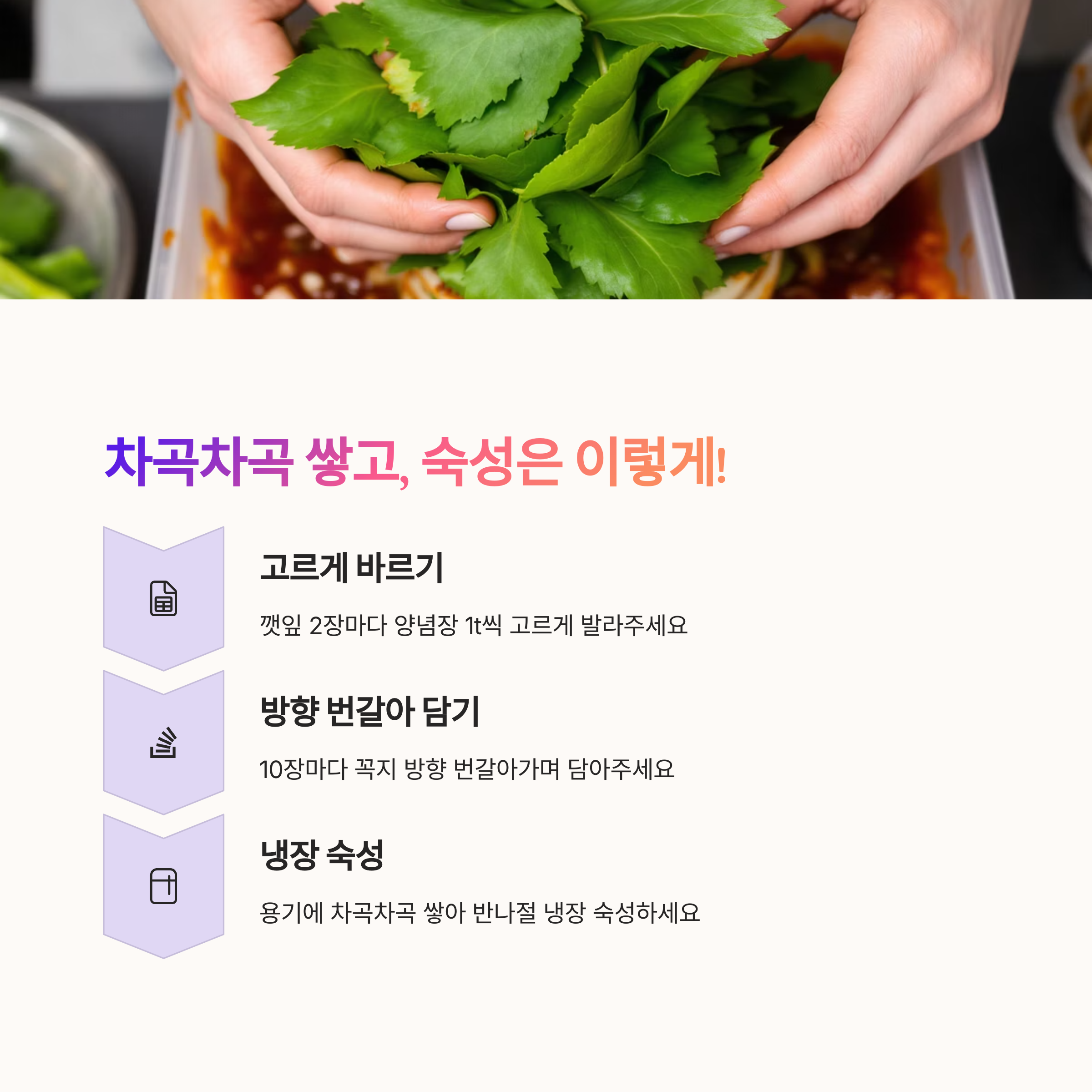 | 4단계: 숙성 및 보관 | 실온에서 1~2시간 정도 두어 양념이 깻잎에 배도록 합니다. 그 후 냉장고에 넣어 숙성시키면 됩니다. 하루 정도 지나면 양념이 잘 배어 더욱 맛있게 즐길 수 있습니다. |