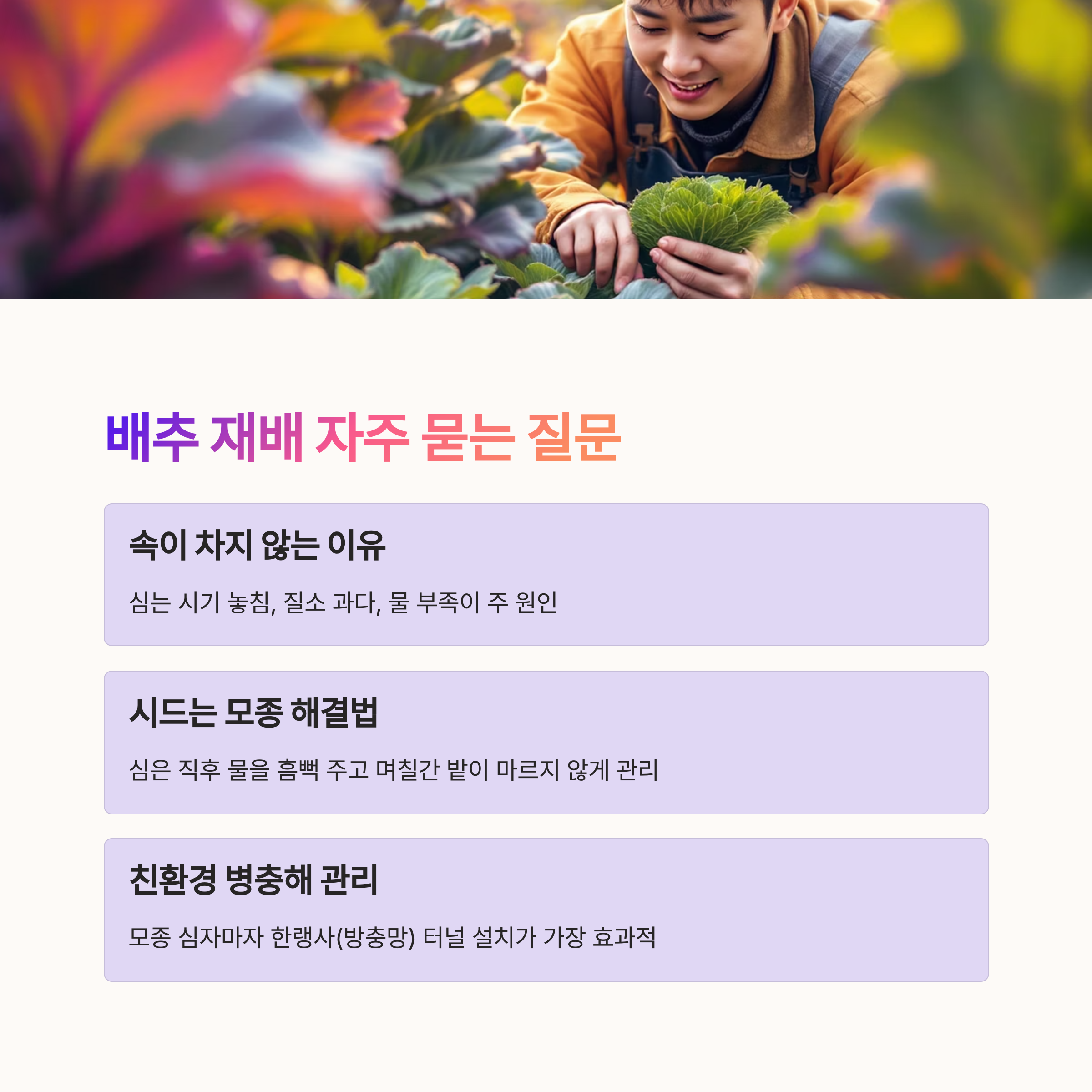병충해 관리: 배추흰나비 애벌레, 벼룩잎벌레 등이 가장 큰 적입니다. 모종을 심은 직후 한랭사(방충망)를 씌워주면 벌레 피해를 획기적으로 줄일 수 있습니다.