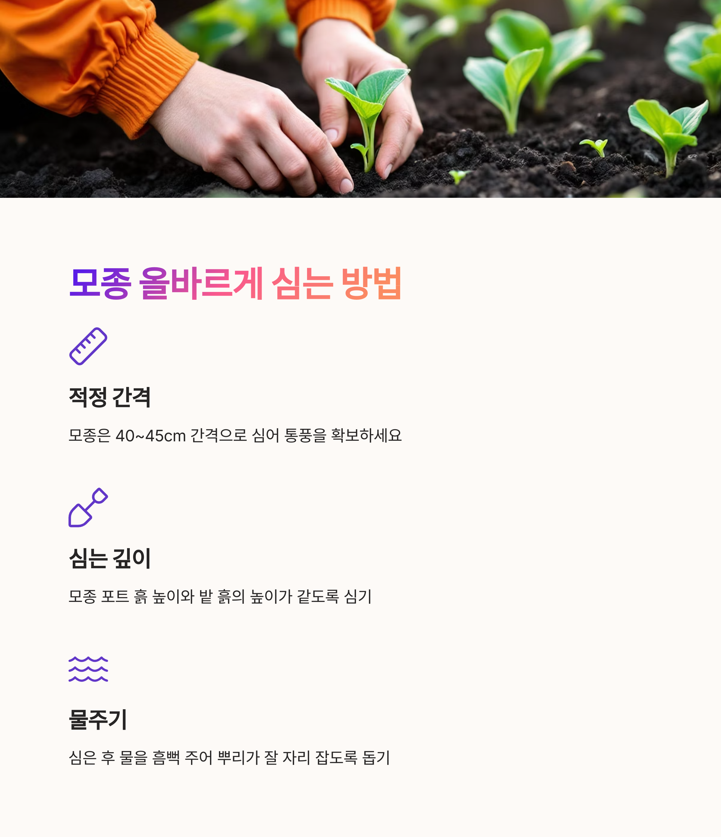 밭 준비가 끝났다면 드디어 모종을 심을 차례입니다. 올바른 김장배추 모종 심는방법은 배추의 초기 생육, 즉 뿌리 활착에 결정적인 영향을 미칩니다.